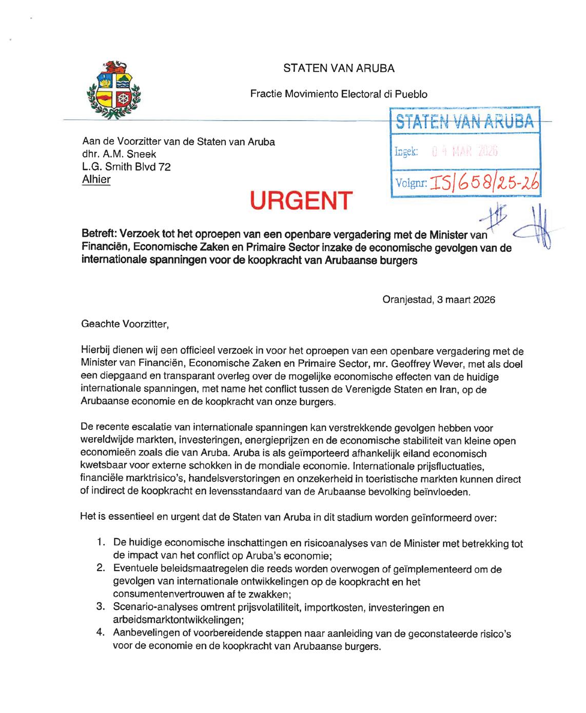 ORANJESTAD - E situacion mundial actual ta sigui crea hopi incertidumbre, y esaki ta tin un impacto directo riba nos comunidad na Aruba. E subida continuo den costo di bida ta pone presion riba cada cas, cada familia, y cada empresa. Despues cu e conflicto na Iran a cuminsa dia 3 di maart,