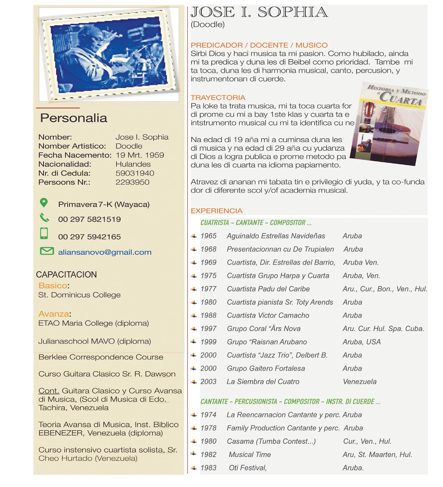 Lo tin difirente tent cu cuminda crioyo y show cu artista y gruponan di baile. Aki ta sigui e Biografia di Jose “Doodle” Sophia
