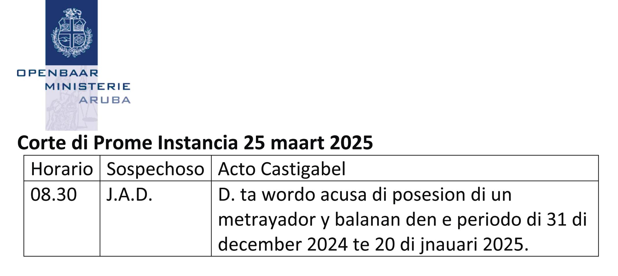 Huez a dicidi awe, riba peticion di Fiscal di Husticia, pa duna ordo pa detencion (gevangenhouding) di e sospechoso S.R.K. pa un termino di 90 dia, den cuadro di un investigacion di delitonan sexual. Prome cu e periodo aki termina, e sospechoso mester wordo presenta (proforma) dilanti Corte den Prome Instancia.