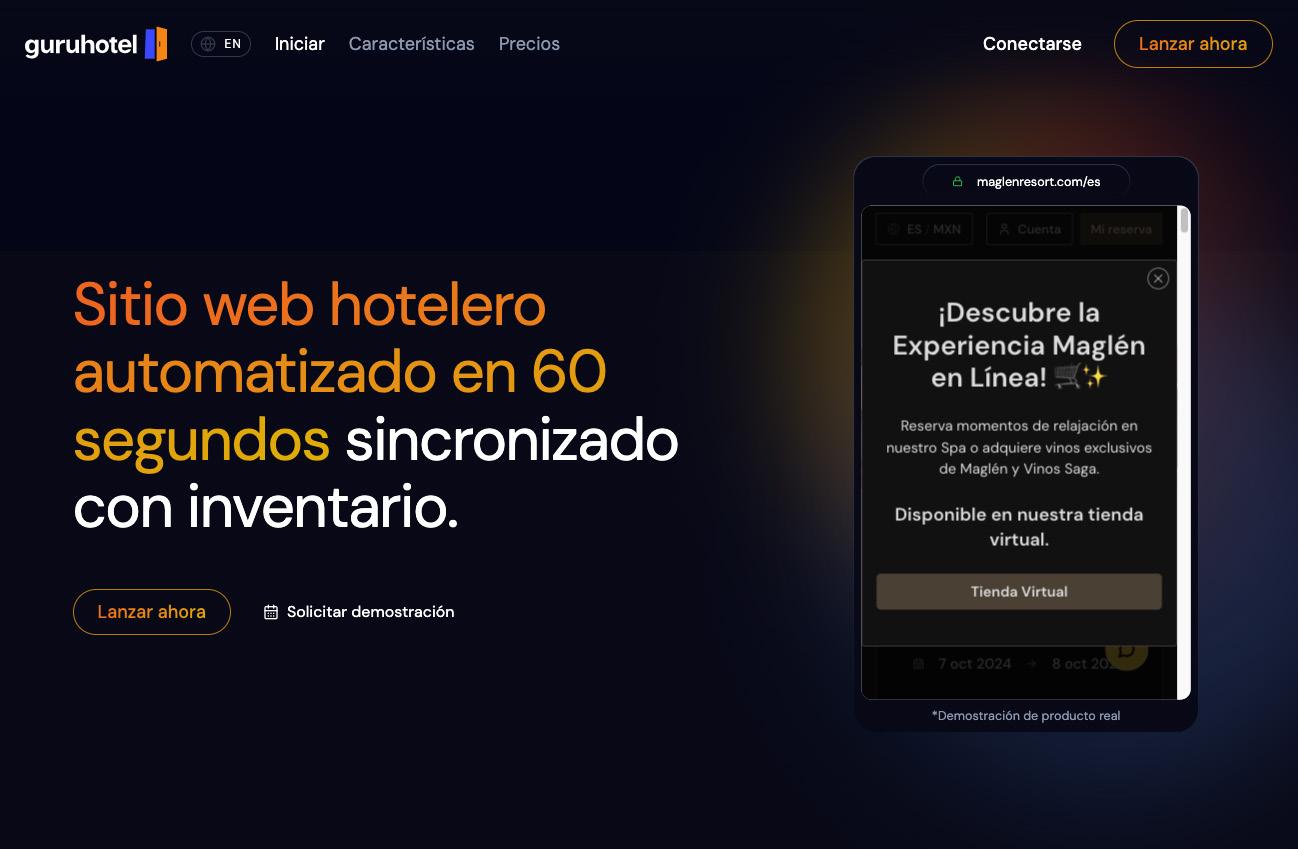 GuruHotel funciona como una solución integral para la gestión de sitios web, reservas y pagos en hoteles. Entre sus ventajas destacan la integración rápida donde los hoteles pueden crear su sitio web y conectarlo con su inventario en tiempo real, así como reducción de comisiones y una mejor conversión, lo que incrementa la tasa de conversión en reservas directas.