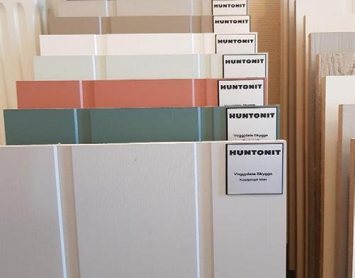 TilvalgVegger i alle rom leveres av typen kostemalt 5-bord veggplater fra Huntonit i fargen hvit NCS farge S0505-Y.