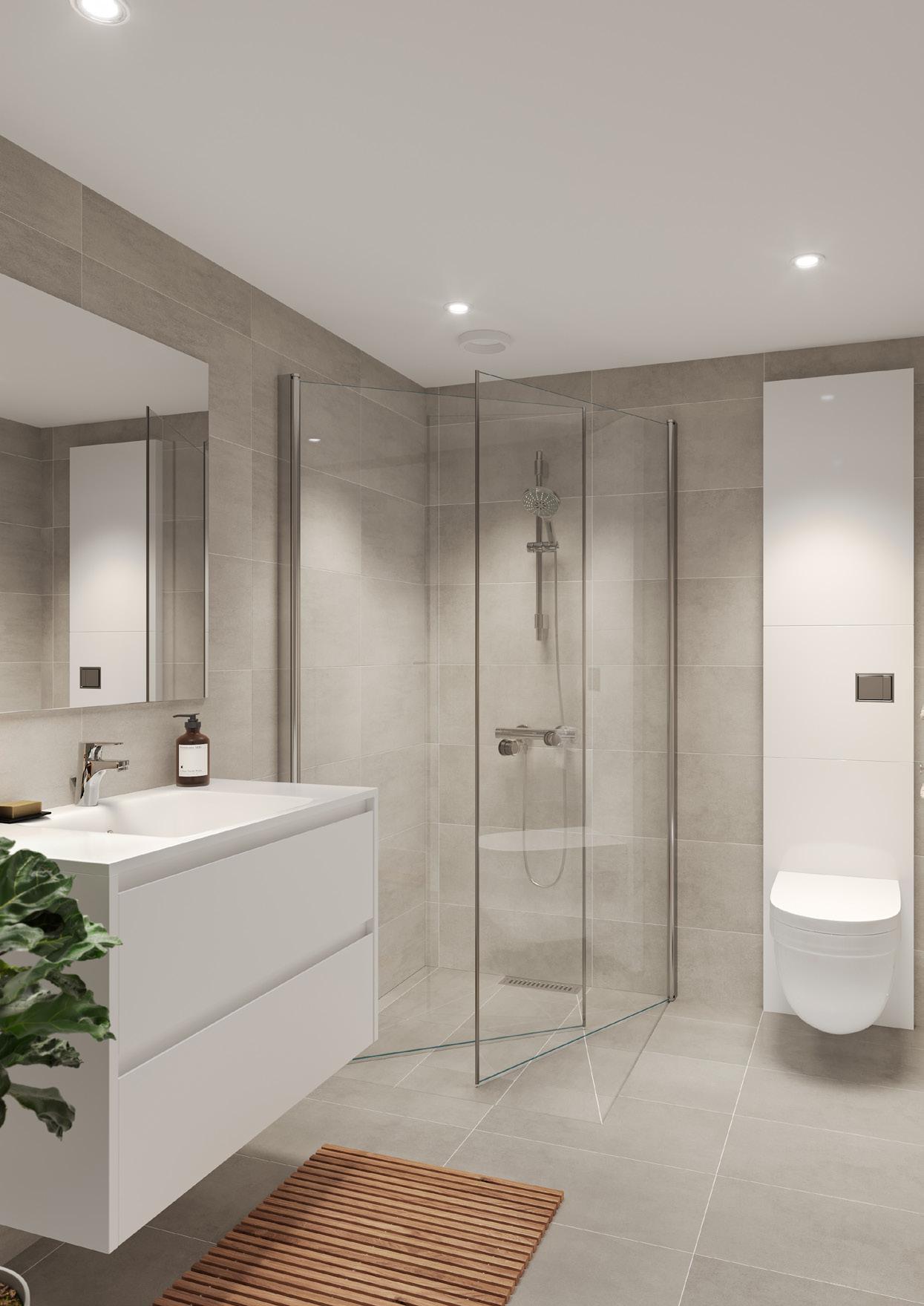 Gled deg til å bo i en moderne leilighet med et friskt og sunt inneklima. Leilighetene får balansert ventilasjonsanlegg med varmegjenvinner. Dette betyr at systemet sørger for å tilføre riktig mengde luft som er filtrert, renset og forvarmet, for så å trekke ut samme mengde «oppbrukt» og dårlig inneluft. Den friske luften tilføres i stue og soverom via ventiler i himlingen. Den gamle luften fjernes via ventiler i bad, vaskerom og bod. Anlegget bytter ut luften i leiligheten flere ganger om dagen.