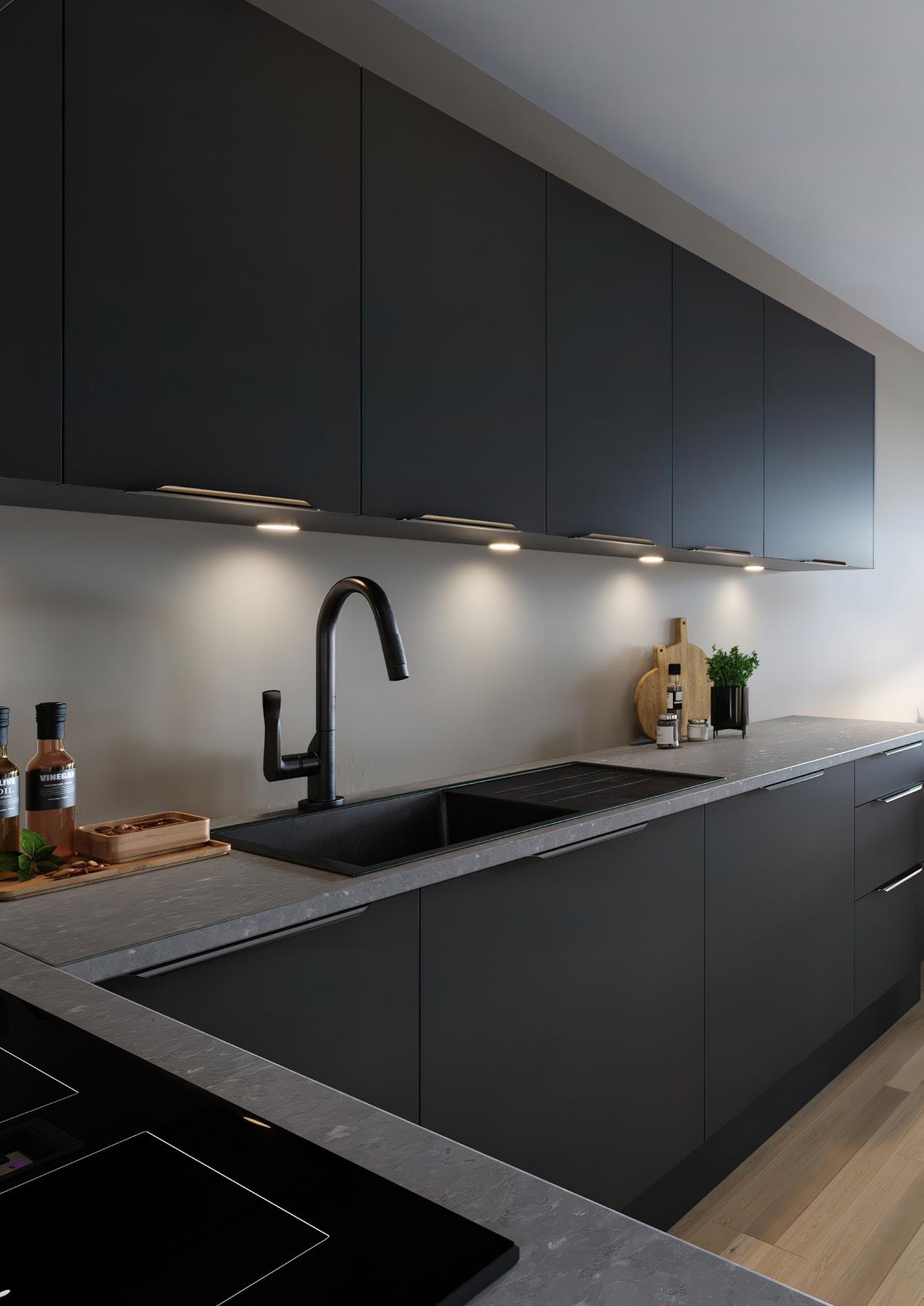 Kjøkken og bad er nøye planlagt, både design- og funksjonsmessig, og noen av leilighetene kan få skyvedør til innvendig bod og walk-in-closet. Litt luksus - hver dag.