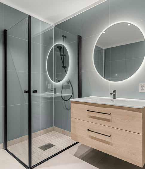 Bad/Vask leveres med 100 cm baderoms innredning, hvit heldekkende servant og hvite fronter, samt speil med lys over. Det er forberedt for vaskemaskin. Dusjdører i leilighetene er 90 cm. i herdet glass med sving. Hvite vegghengte toaletter med veggsisterne Geberit Monolith i hvit utførelse.