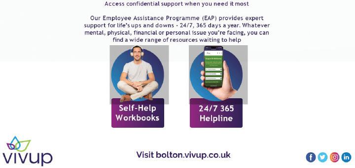 The Employee Assistance Programme is a free, confidential service offered by Vivup and can be accessed by telephoning the helpline number, available 24/7. A wide offering of resources is available on the website and includes downloadable self-help books on a range of topics.