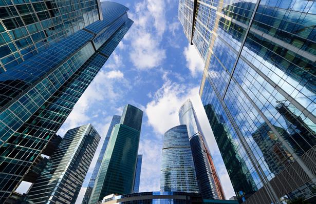 The light beige concrete columns at the base of the building support what appears to be an effortless fully-glass structure.