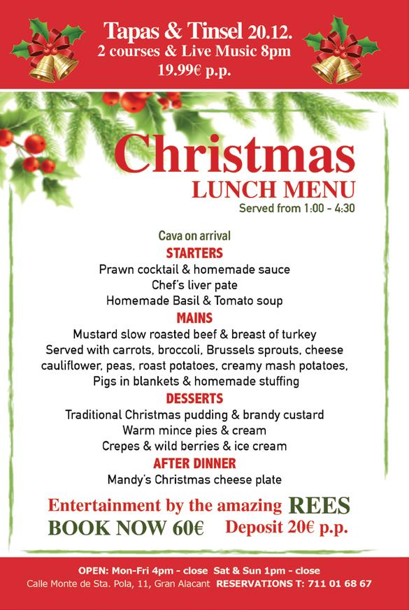 NEXT BOOK CLUB MEETING Wednesday 30 November 2pm, Skipper Bar MASA Square We meet up once a month, discuss the books we are reading now and suggest new ones. Anyone interested in joining us or looking for more information please contact Beth on Whatsapp +44 7853 363060 PLAZA MAYOR CWW Electrical Services Qualified electrician All electrical work undertaken Tel: 617 872 405 *** Contact Clive or Wendy