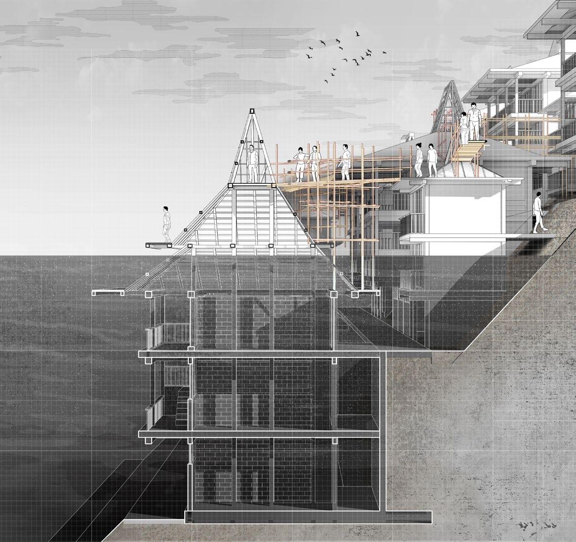 The project therefore aims to bring people closer to water, not just for the sake of nostalgia, but also to allow people to understand their high reliance on water. Rather than treating water as an economic resource, the project highlights its pleasurable aspect. The site is especially apt as people used to sail along the Pasir Panjang coastline, using the traditional Kolek and Jong. A boat building workshop facility is proposed near the tip of Labrador Park where the public can observe and learn the process of boatbuilding that has long disappeared from Singapore. At the same time, they can also learn to build their own boats and use them to sail away to the sea. Boat does not only become an object that evokes memories and nostalgia but also serves as a tool for people to escape the confinement of such industrial barricades.