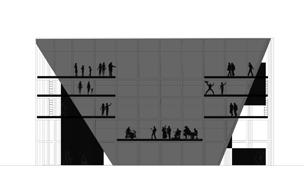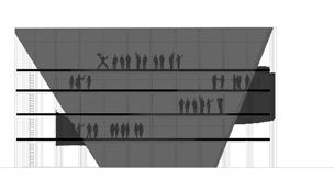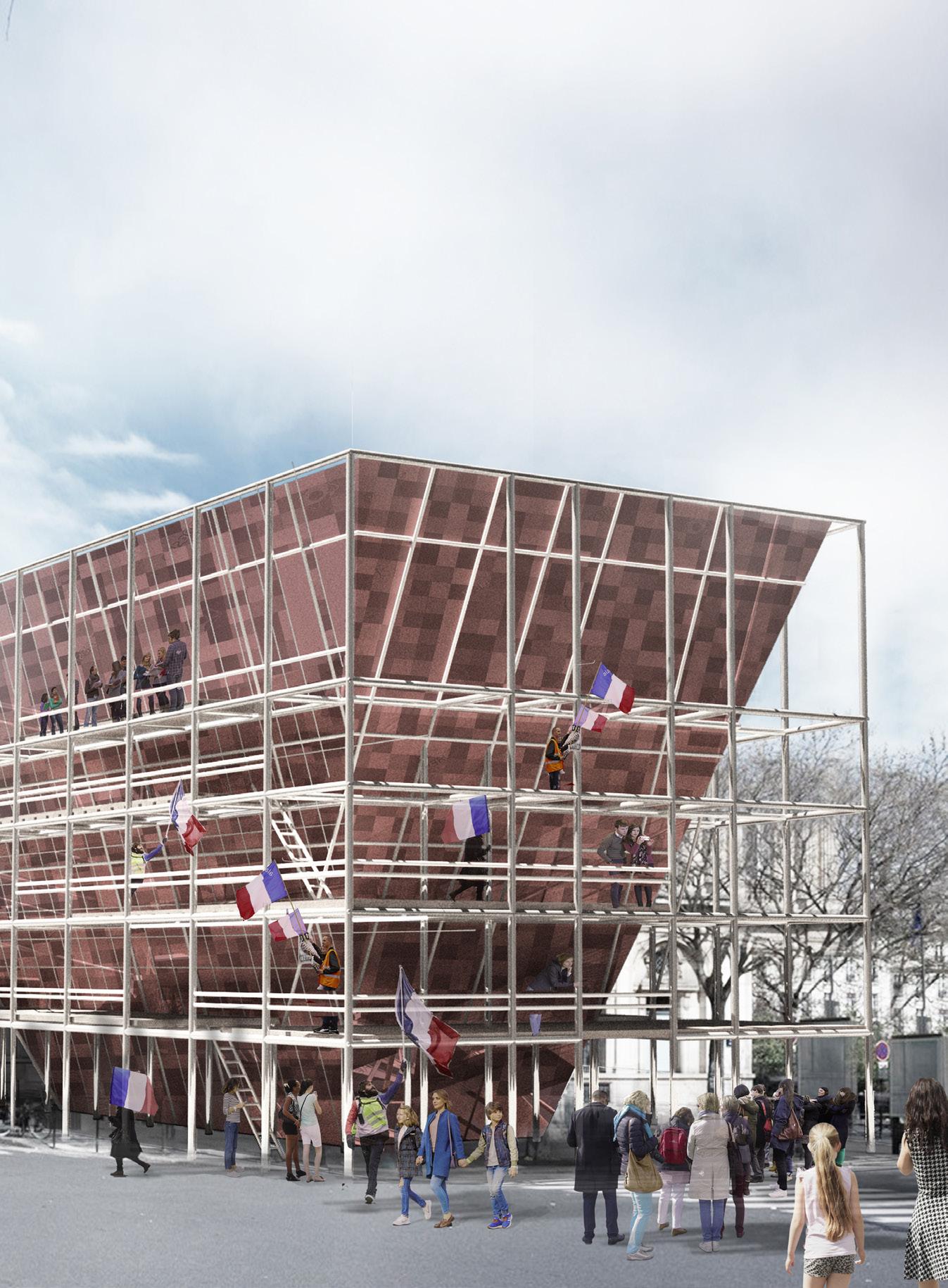 teractive and transparent service agenda. People are symbolically placed over the state, in that the public is ensured visual connection to key notarial functions from above. As a homage to the most iconic Parisian landmarks such as the Eiffel Tower, the Louvre, and the upcoming Triangle Tower, our proposal takes the form of an inverted pyramid, referencing, yet subverting the Parisian values that they stand for. The gestural inversion returns the ground floor to the people. Going back to the French Revolution, where the ‘mob’ protested against tax exemptions for the rich and succeeded, the spirit of speaking their mind is inherent, unavoidable and natural. Our proposal provides an alternative platform to express their opinion publicly through a customizable frame structure for grassroots initiatives which integrates a media wall and powerful political art installations, to shift violent protesting towards a more peaceable and effective method.