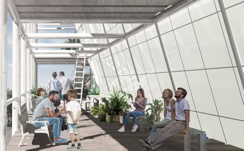On normal days, the exterior facade becomes an elevated urban park for people to spend their leisure time. Urban furniture and greenery provide rest spaces and shade.