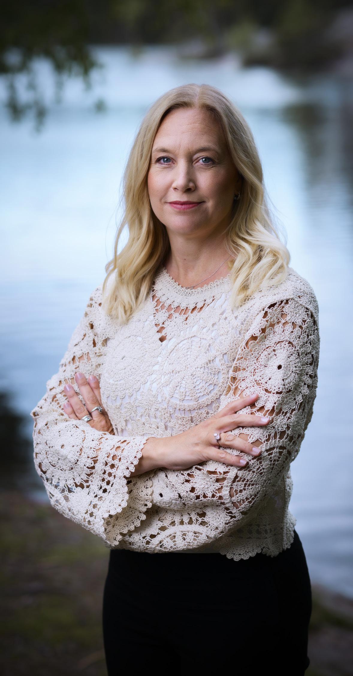 Lerum utanför Göteborg men bor sedan många år i Saltsjöbaden. Hon är civilekonom och har även studerat litteraturvetenskap, engelska och franska, bland annat under en tid i Paris. Sedan slutet av 1990-talet har hon haft flera ledande befattningar i bokbranschen. Tolv andetag till sjön är hennes tredje roman och den första i en trilogi om kvinnlig vänskap, frigörelse och livsval i 1940-talets Norrland.