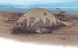 hänger i toviga stripor. Delar av hennes ansikte är borta och skelettet är blottat på flera ställen. Ur en av ögonhålorna kikar en mus fram.