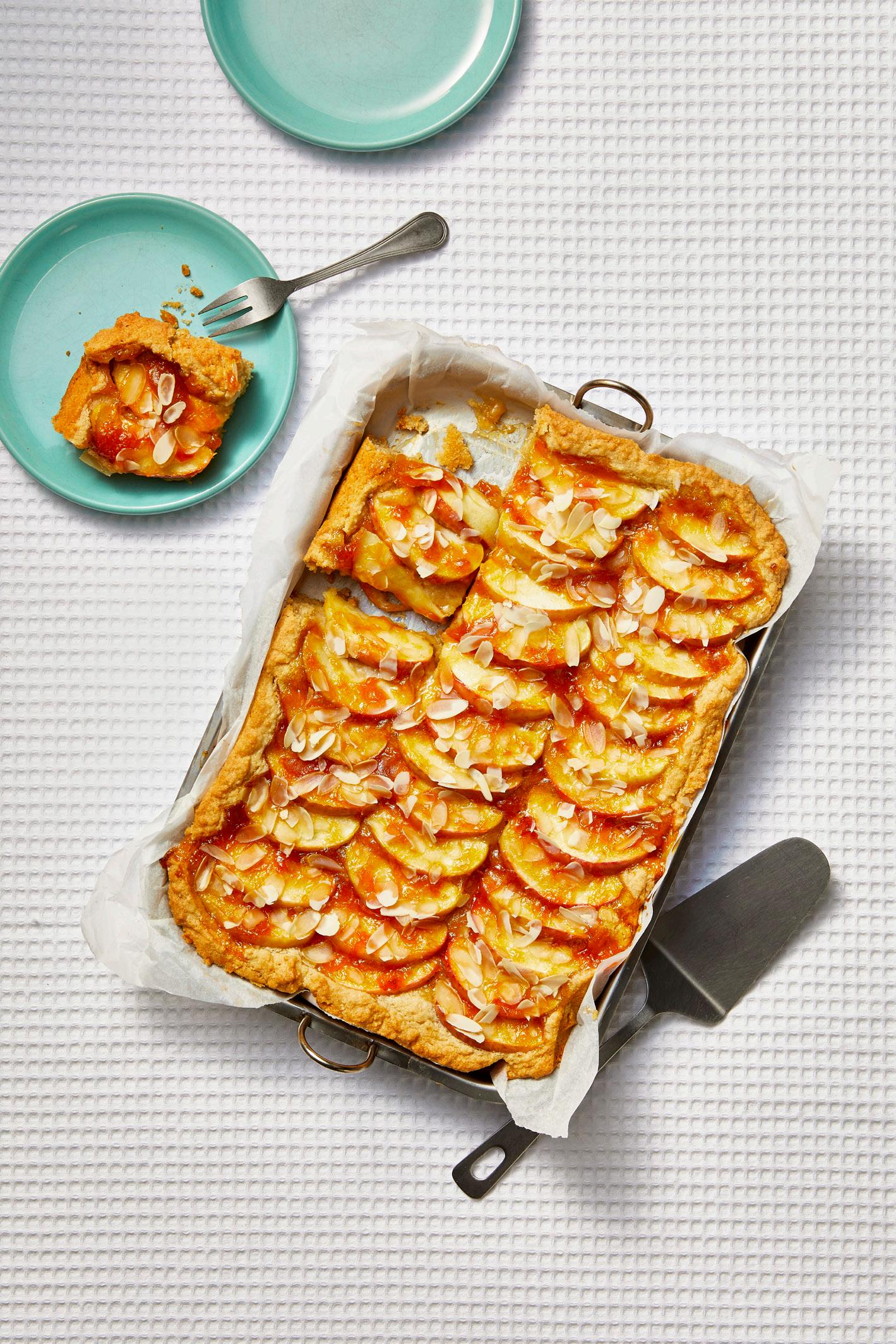 2 Verdeel het beslag in een egale laag over een met bakpapier beklede bakplaat. Snijd de appels in partjes, verwijder het klokhuis en snijd de partjes in plakjes. Leg dakpansgewijs in rijen in het beslag, verdeel de jam erover en bestrooi met het amandelschaafsel.