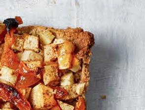 INGREDIËNTEN • 125 g blanke rozijnen • 150 g gedroogde abrikozen • 8 appels, geschild en in blokjes • rasp en sap van 1 sinaasappel • 2 theel. kaneelpoeder • 125 g hazel- of walnoten, grof gehakt • 200 g boter • 125 g abrikozenjam met minder suiker + extra om te bestrijken • 450 g volkorenbloem + extra om te bestrooien • 30 ml olijf- of notenolie • 100 g havermout • deegroller • kleine bakplaat, ingevet • evt. aluminiumfolie