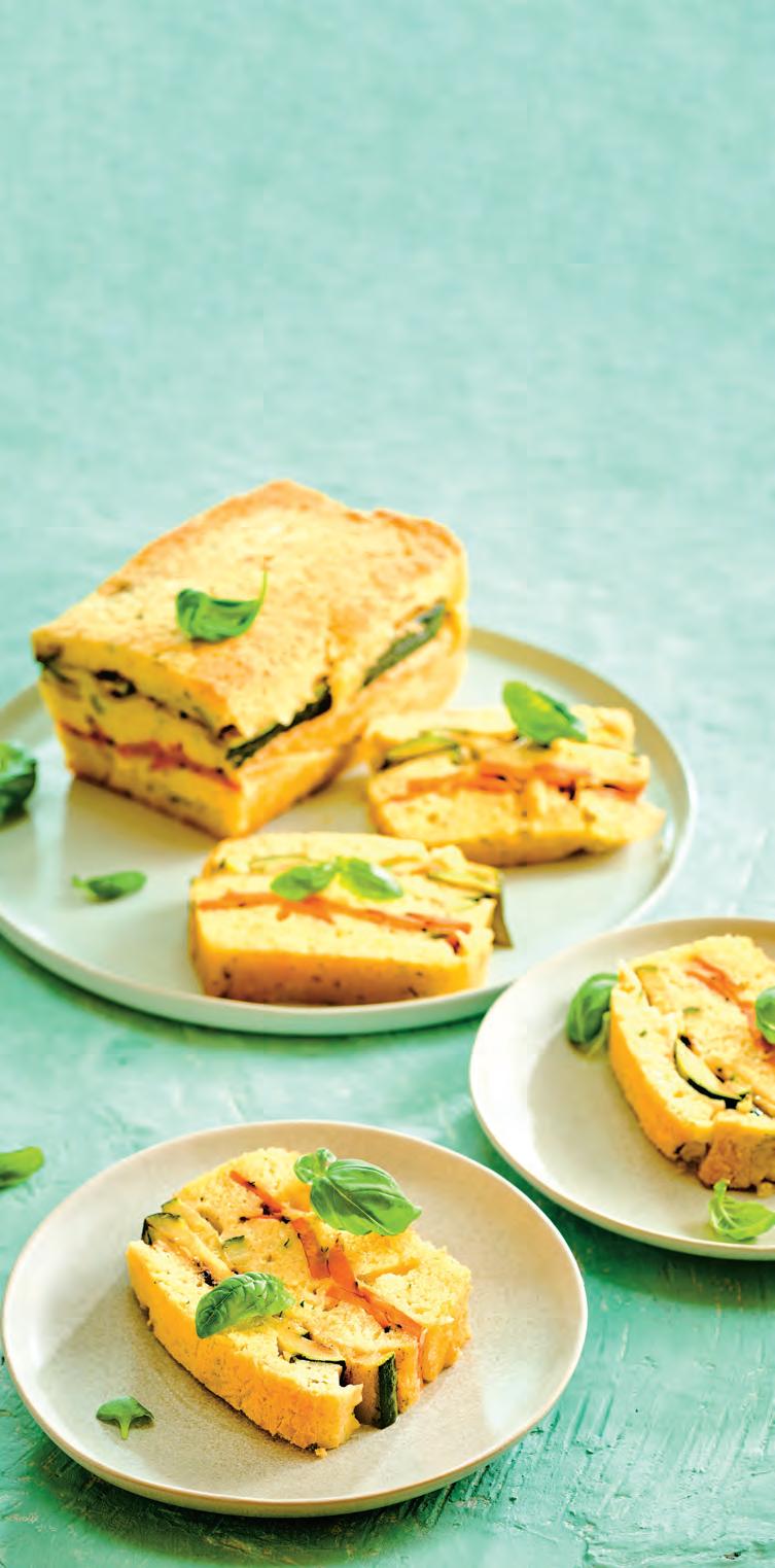 3. Bekleed de bodem van de cakevorm met bakpapier. Schep een derde van het beslag erop. Leg daarop plakken wortel en verdeel weer een derde van het beslag erover. Leg plakken courgette erop en dek af met de rest van het beslag.