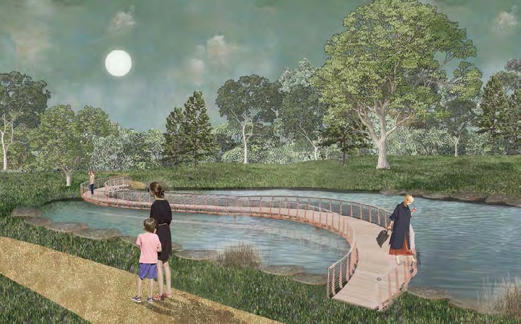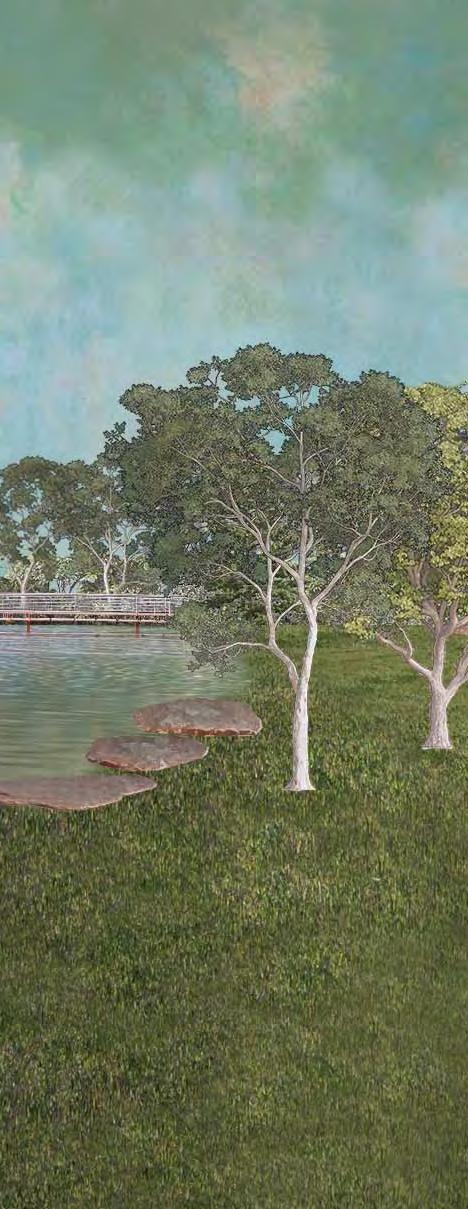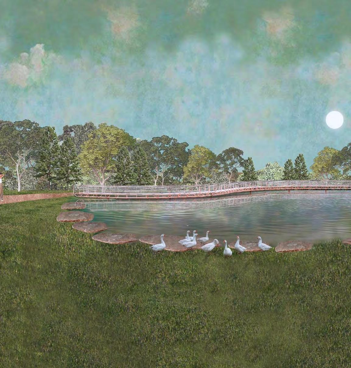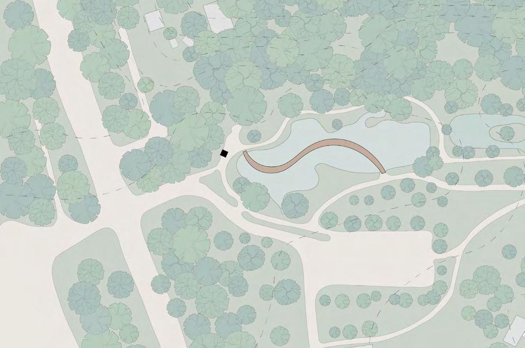 A sinuous, non-intrusive steel framework was envisioned to create the illusion of a weightless bridge floating atop the water. The steel structure supports a slatted timber deck that snakes its way over the quaint park pond. The steel structure gives the bridge a sense of rhythm and movement with a central spine and flanking rib plates that take on the role of transverse beams. Due to the winding nature of the bridge, visitors are encouraged to pause and take on a meandering pace.