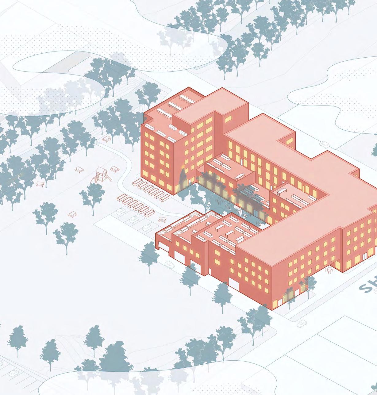 3 to 1, Go! is an affordable housing project that looks to unify, accommodate, and house 3 target demographics in a 6-storey red brick building. Students, low income families, and the houseless are the demographics that this project is curated towards.