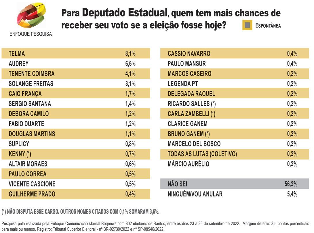 Como a margem de erro é de 3,5 pontos percentuais para mais ou menos, há espaço para cresci mento dos números apresentados na pesquisa. Vale lembrar que nas eleições de 2018, o total de votos válidos para a Assembleia Legis lativa em Santos chegou a 231.672.
