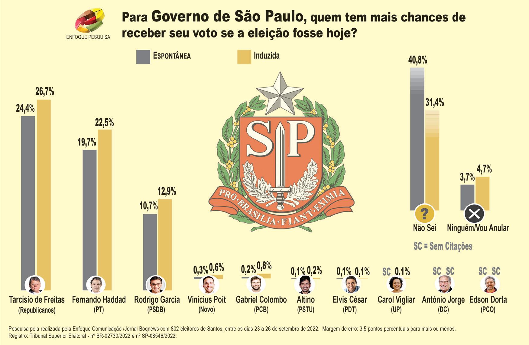 Afinal, são 44,3% dos eleitores, conforme a pesquisa Enfoque/Boq news. Ao contrário da eleição passa da, onde nomes de fora da Baixada Santista foram bem votados, como os deputados Joice Hasselmann (PSDB) e Eduardo Bolsonaro (PL), tudo indica que eles terão uma vo tação bem menor na Cidade neste domingo (2).