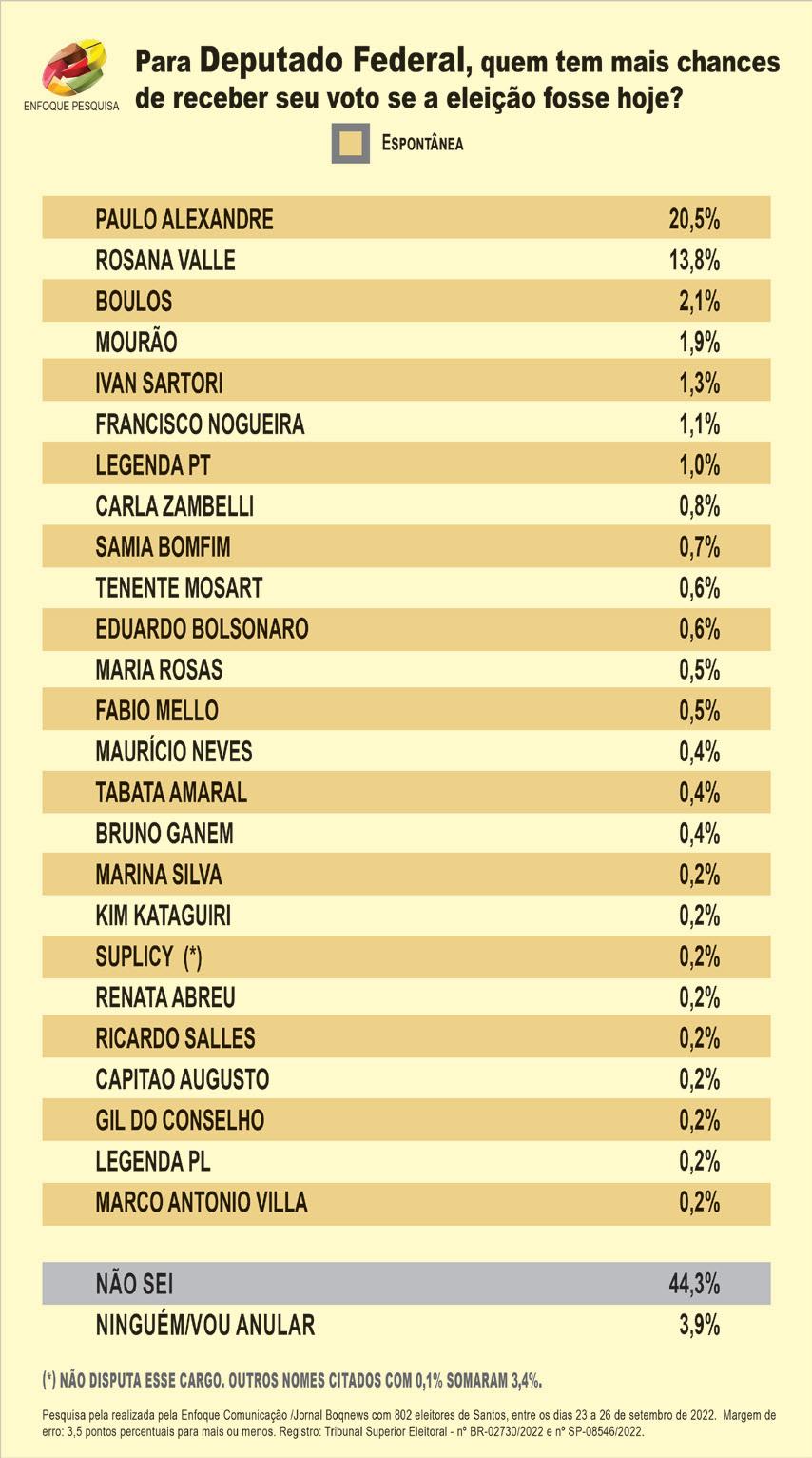 Na Cidade, ele obtém 20,5% dos votos de forma espontânea pelo eleitorado, quase no limite da margem de erro da segunda coloca da, a deputada federal Ro sana Valle (PL), com 13,8%. Em 2018, ela obteve 34.844 votos em Santos.