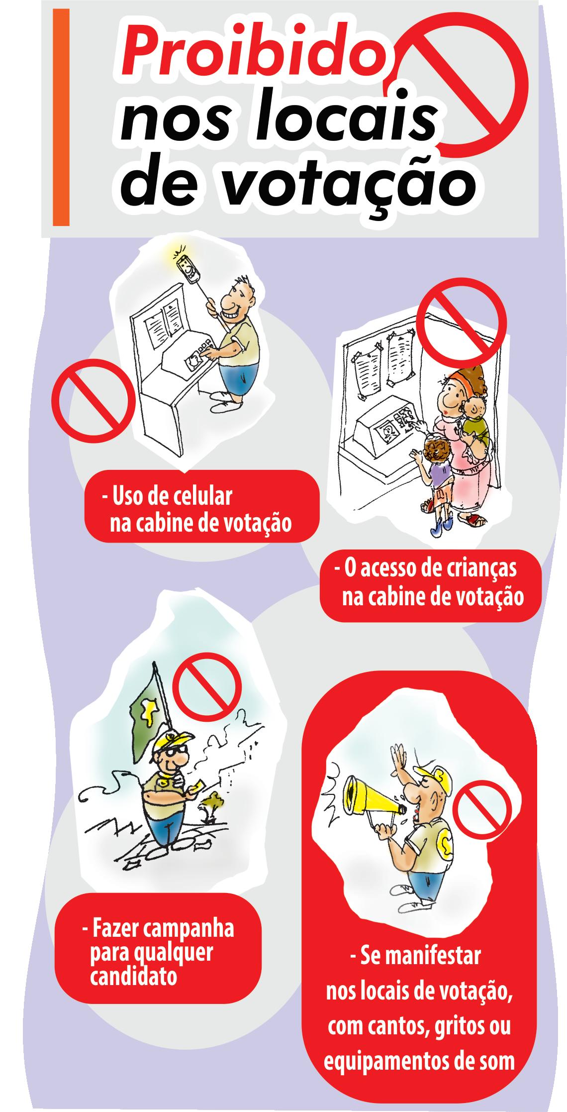 mesa ao lado (confira no quadro, o que não é permitido). Vale ressal tar que se o eleitor estiver come tendo uma infração, ele poderá ser conduzido pelas autoridades que estarão nos locais de votação.