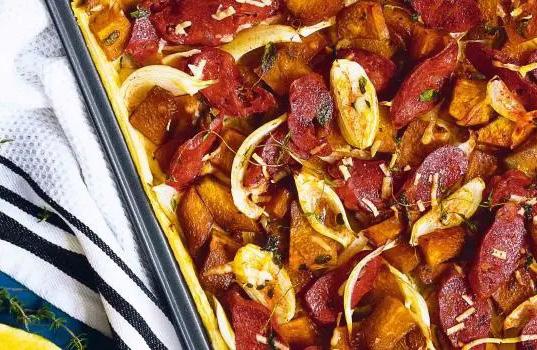 Em uma assadeira, coloque a abóbora, o mel, o açúcar mascavo, o azeite, o sal e a pimenta-do-reino. Cubra com papel-alumínio e leve ao forno médio (180°C), preaquecido, por cerca de 30 minutos. Reserve. Em outra assadeira untada com manteiga, coloque a massa folhada e espalhe o queijo mascarpone. Adicione a abóbora reservada, a linguiça, a cebola, o Tempero e Sabor, o orégano, a manteiga e o queijo parmesão. Leve ao forno médio (180°C), preaquecido, por cerca de 20 minutos. Sirva.