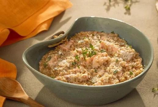 baixo, sem deixar ferver. Em outra panela, coloque metade da manteiga, a cebola, o alho e até dourar. Acrescente o salmão e deixe refogar por cerca de 4 minutos ou até ficarem macios, não deixe-os desmanchar. Reserve o salmão em um recipiente. Coloque a Aveia no refogado da panela do salmão e refogue por mais cerca de 3 minutos. Adicione o vinho até evaporar. Adicione uma concha da água fervida com o sal e cozinhe, mexendo sempre. Vá adicionando as conchas de água até que a Aveia esteja no ponto al dente. Acrescente o salmão reservado, a outra metade da manteiga, as raspas de limão, o queijo ralado e o tomilho, misture lentamente. Sirva.