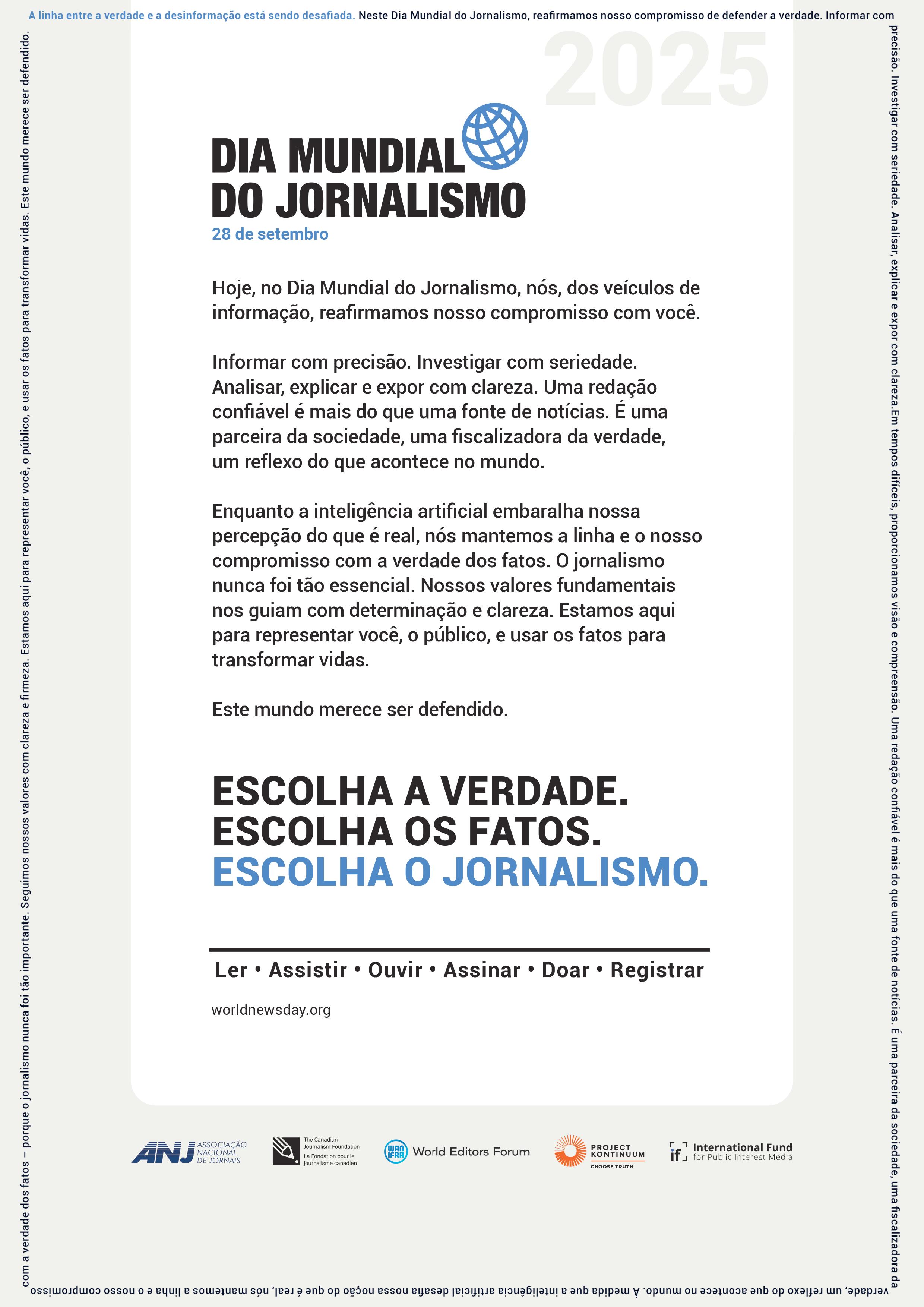 NesteDiaMundialdoJornalismo (28), muitos olham para o futuro com preocupação e incerteza. Vivemos em umtempodemudançasconstantes,de instabilidade global e de insegurança que desafia a todos. Nosso mundo se apoiacadavezmaisnainformação-às vezes quase exclusivamente - e a imprensa é a base desse sistema. Assim como água e energia, só percebemos seuvalorquandonãoestádisponível.