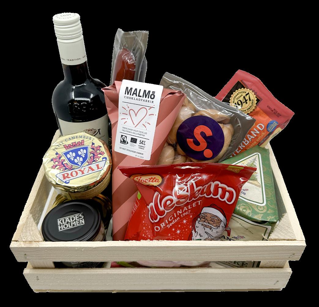 Innehåller: Blossa glögg, choklad från Malmö Chokladfabrik, Castello Cheddar, prinskorv från Stensåkra, julsenap från Koster, Annas pepparkakor, sill från Klädesholmen, rökt påläggskorv från Stensåkra, Camembert Royal, skumtomtar, isterband Kalas samt julknäcke från Leksands.