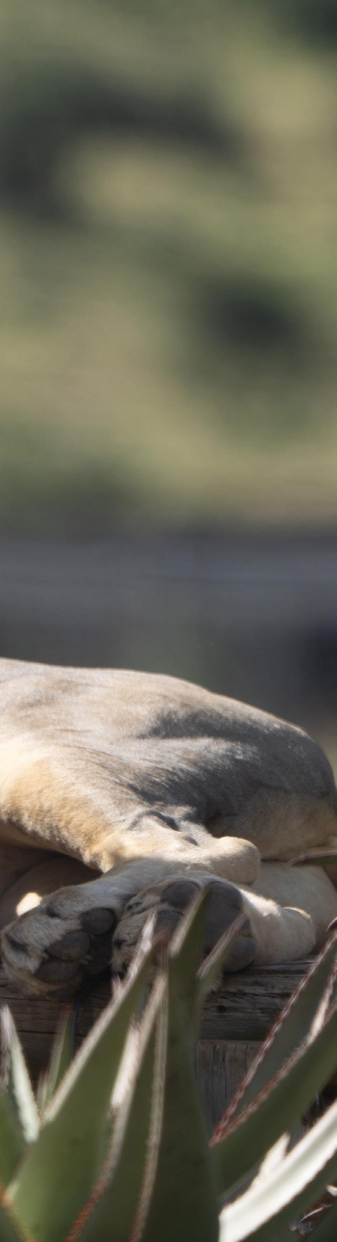 With your help, Zeiss is doing well and gaining confidence. He loves to hide in the dense undergrowth so, when he allows himself to be seen, this is a real treat! These past few weeks he’s been surprising us a lot, popping out unexpectedly and strolling around. In recent weeks, we’ve been monitoring him at night and he’s noticeably more curious about his neighbours, King and Thea (page 8). Zeiss likes to walk close by when these rescued lions are lying close to the fence line.