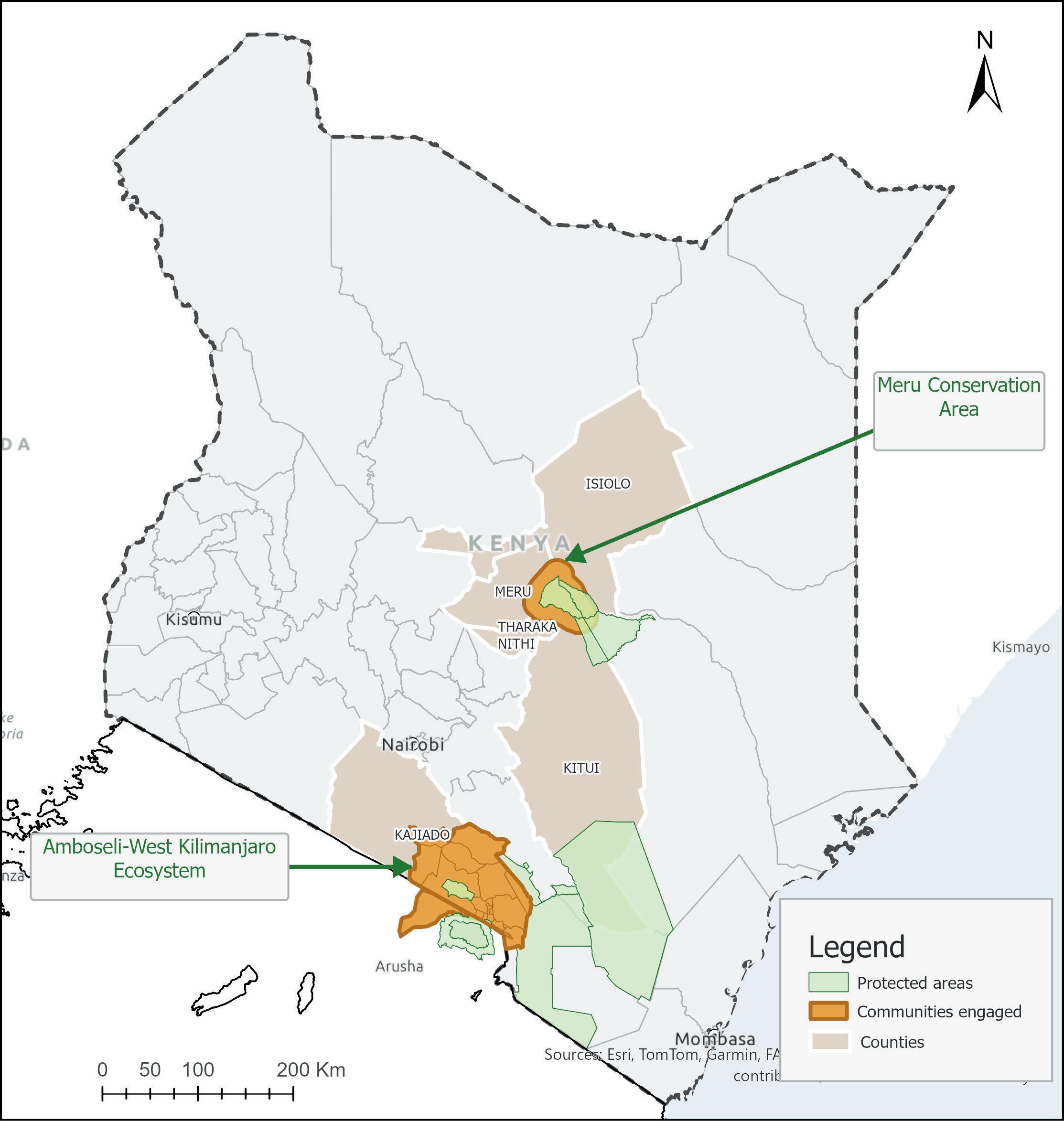 Amboseli West-Kilimanjaro Ecosystem: Communities within the Amboseli West-Kilimanjaro Ecosystem on the Kenya-Tanzania border. Approx. 6,500 km², comprising Amboseli National Park, the surrounding community land and Enduimet Wildlife Management Area.