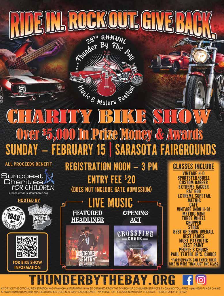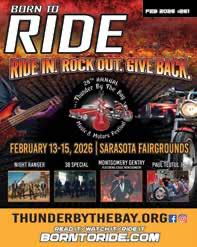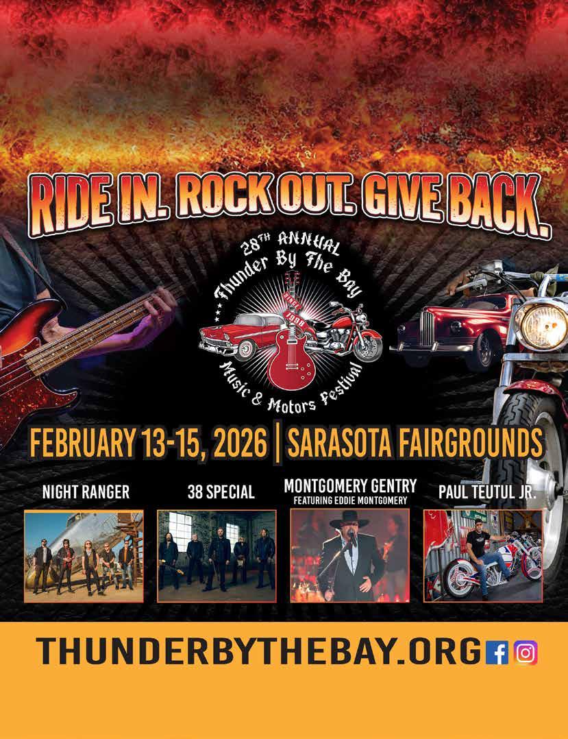 They’ll be three days of headline acts, rows of vendors, car and bike shows, a biker rodeo and a charity dice run. All proceeds benefit Suncoast Charities for Children. Special guest Paul Teutul Jr. from American Choppers will be there with some of his builds, signing autographs and posing for pictures. Check out full details at: thunderbythebay.org or see their ad in this month’s magazine.”