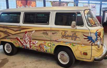 When Hayes spotted a VW bus for sale along the highway, we didn’t hesitate. Suddenly I owned a 1964 pop-top camper, complete with cabinets and a bunk. I carved out space for paint, tools, and Superdog—and then did what came naturally. I lettered it.