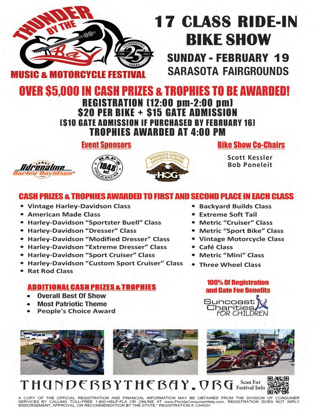 Since this is a major fundraiser for Suncoast Charities, there will be a gate fee of $15 per day, per person. Advance tickets are on sale at $10 per day through the 16th of February. These tickets can be purchased on the TBTB website or at Adrenaline Harley-Davidson.