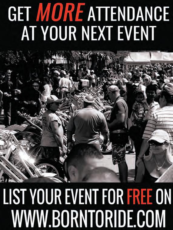 Summer is coming, are you ready to ride? Born To Ride sponsor attorney Fran Haasch is on hand in this issue to tell you all about various types of motorcycle insurance coverage that is available. Are you covered properly? See her two-page insurance primer in this issue. Also, if you have insurance, we need you to help fight for your freedoms! Insurance companies are trying to pass bills so they don’t have to pay out when you need them most. See the flyer in this issue. Bert’s H-D is sponsoring a ride to Tallahassee soon. Stay tuned.