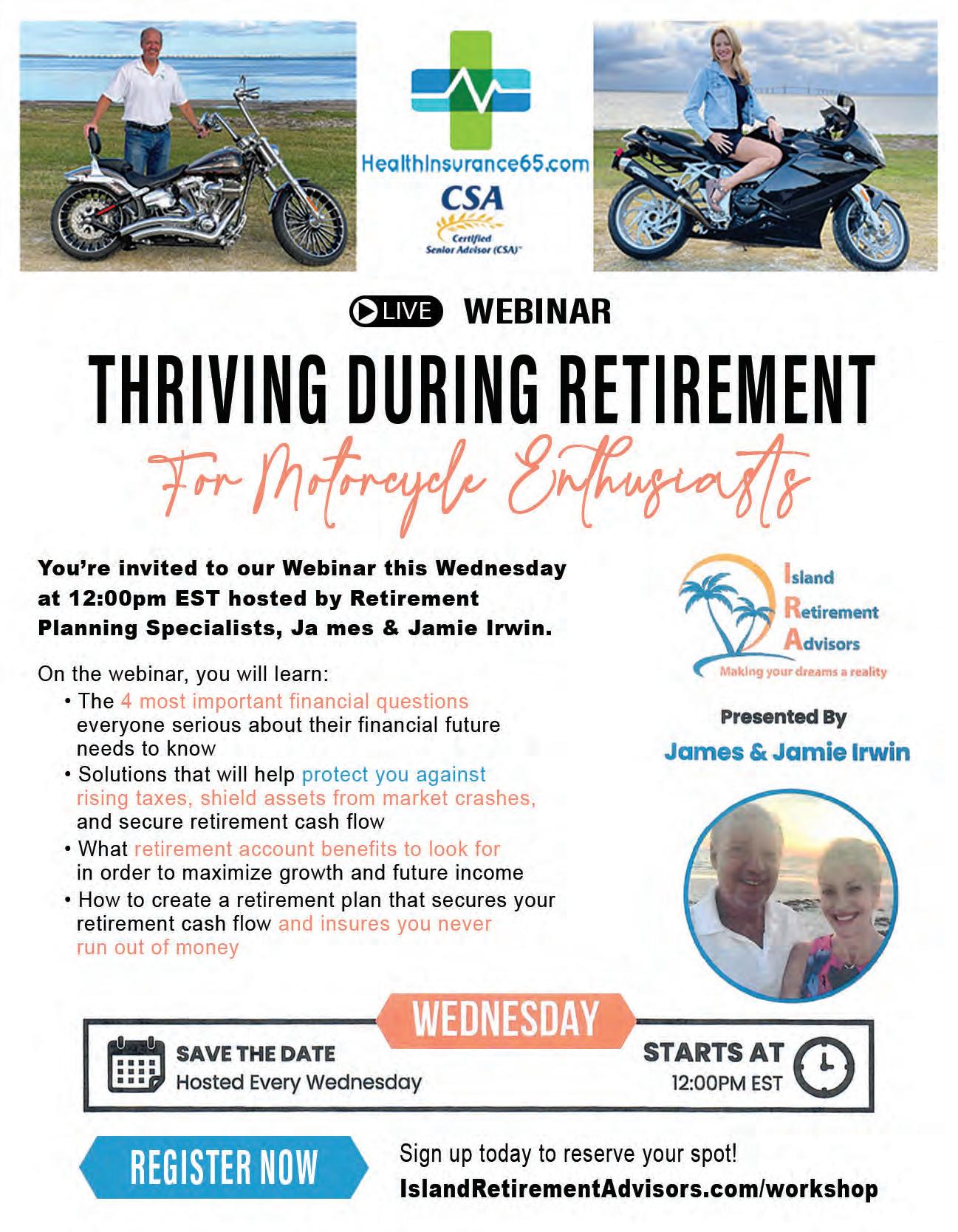 See you all on the ride and remember ... Its never too late to start planning for retirement. Time goes bye fast! Remember there is not a one size fits all paint by the numbers solution. All of our situations are unique. You don’t need more money you just need a better plan. After having the privilege to serve tens of thousands of people over the years I can attest to the statement “That money won’t make you happy! But riding a motorcycle will! “