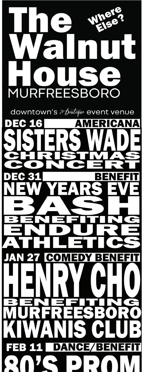 Oaklands Mansion (900 N. Maney Ave.) invites you to celebrate the holiday season at its 2022 Christmas Dinners on Friday and Saturday, Dec. 2 and Dec. 3. Enjoy a traditional holiday dinner by CJ’s Catering and desserts from Simply Pure Sweets at 7 p.m. with admission. The local band Quarterlife plays light jazz and Christmas favorites. A full bar will be provided by Murfreesboro Wine and Spirits and served