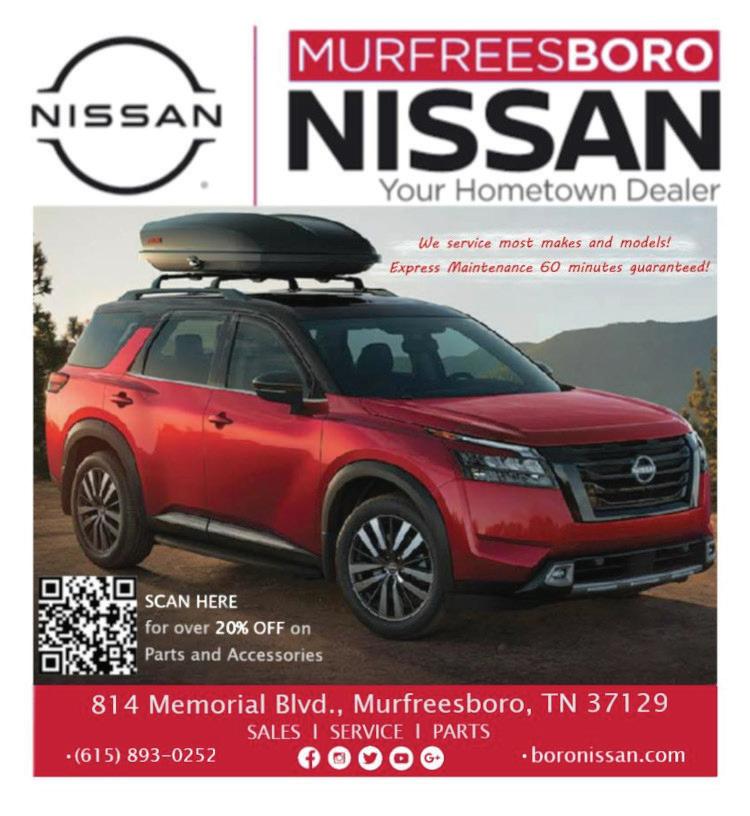 22 18 10 714 W. Main St., Suite 208, Murfreesboro, TN 37129 615-796-6248 TO CARRY THE PULSE AT YOUR BUSINESS or to submit letters, stories and photography: bracken@boropulse.com Publisher/Editor in Chief: Bracken Mayo Copyright © 2023, The Murfreesboro Pulse, 714 W. Main St., #208, Murfreesboro, TN 37129. Proudly owned, operated and published the first Thursday of each month by the Mayo family; printed by Franklin Web Printing Co. The Pulse is a free publication funded by advertisers. Views expressed in the Pulse do not necessarily reflect the views of the publishers. ISSN: 1940-378X Advertising: Nneka Sparks, Bailey Finn Copy Editor: Steve Morley Art Director: Sarah Mayo Contributors: Tiffany Boyd, Delores Elliott, Elisabeth Gay, Bryce Harmon, Laura Lindsay, Blaine Little, Chelsea LoCascio, Zach Maxfield, Sean Moran, Jay Spight, Andrea Stockard, Bill Wilson SIGN UP for the Pulse Weekly Digital Newsletter at BOROPULSE.COM/NEWSLETTER ONLINE: @BoroPulse /BoroPulse The Murfreesboro Pulse @BoroPulse @BoroPulse ON THE COVER
