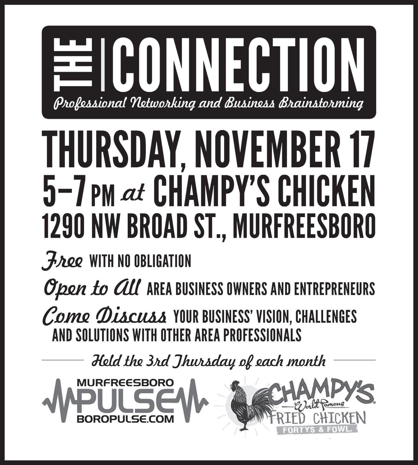Champy’s World Famous Fried Chicken will host the November 2022 installment of The Connection: An Evening of Professional Networking and Business Brainstorming from 5–7 p.m. on Thursday, Nov. 17. All Middle Tennessee entrepreneurs and professionals are welcome to attend this casual, free, noobligation networking event, where they can meet other small business owners and tap into one another’s experience and energy. Champy’s is located at 1290 NW Broad St.