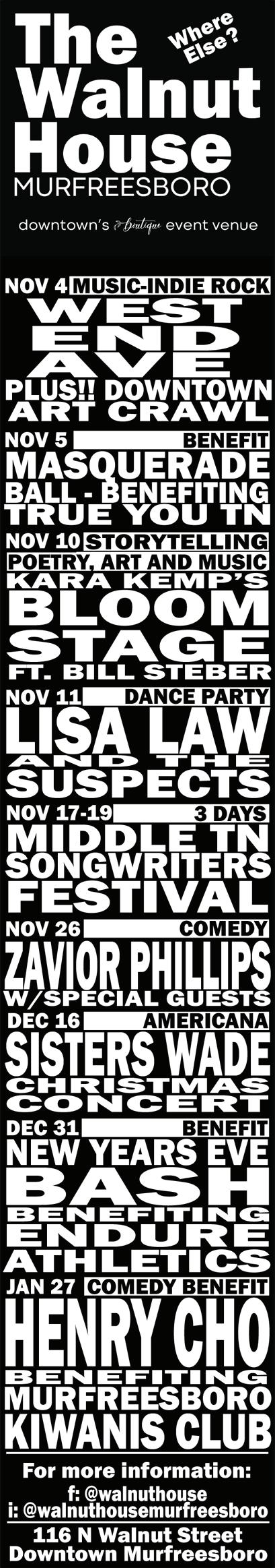 Kick off the holiday season with Main Street Murfreesboro at 5 p.m. on Friday, Nov. 4. Bring the family, discover new stores and visit familiar staples of the historic town as you shop locally. This festive holiday event is full of hot chocolate, small bites, trunk shows and lots of shopping. Some stores will offer demos, holiday gift ideas, stocking stuffers and limited-time specials. Grab food or purchase a gift card from a variety of eateries around Main Street. For more information, find the Holiday Sip, Shop & Stroll event on Facebook.
