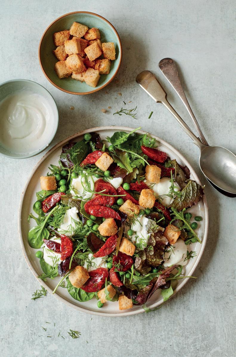 Put the peas, salad leaves and dill into a large bowl with 1 tbsp olive oil. Toss, then portion onto plates. Dollop on the whipped goat’s cheese and divide the saucisson between the plates. Finally, drizzle over any oil left in the pan and scatter over your croutons or crumbled crackers.