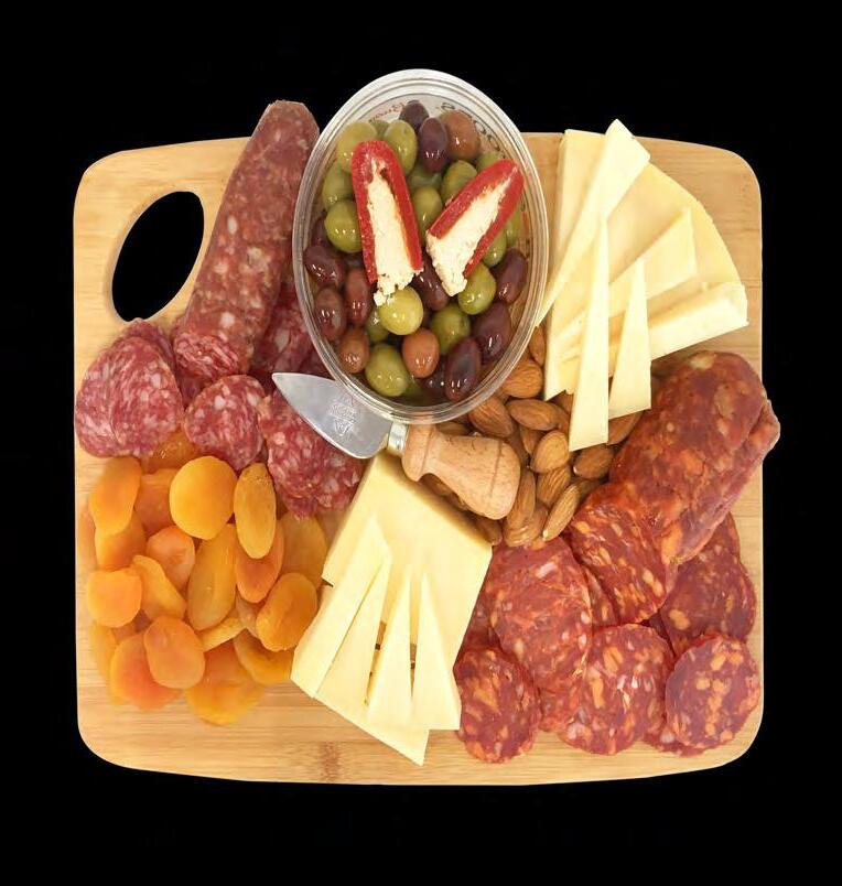 Black Forest Ham, Salami, Prosciutto, Mortadella, Canadian Provolone & Cheddar with Olives in the Center.
