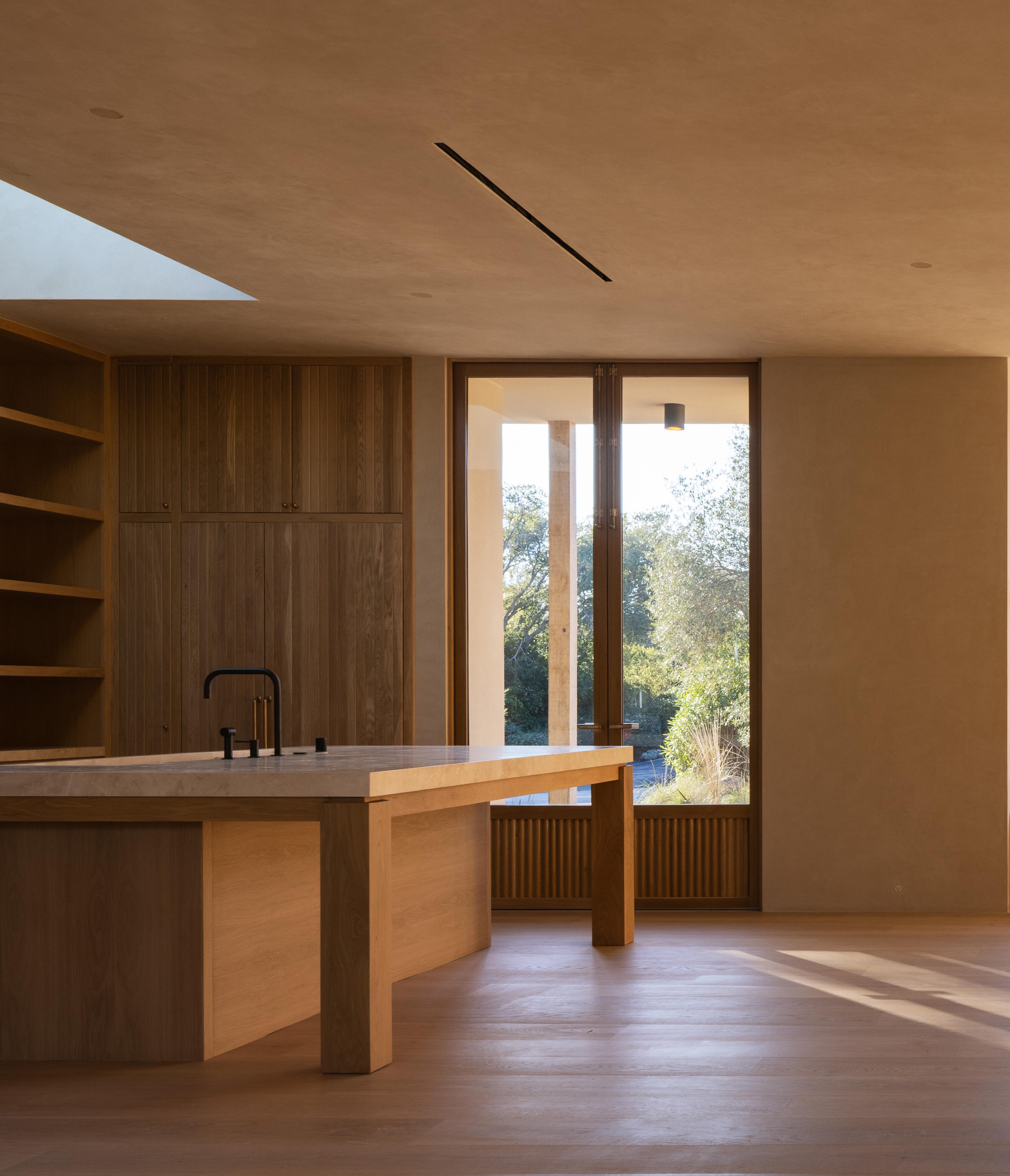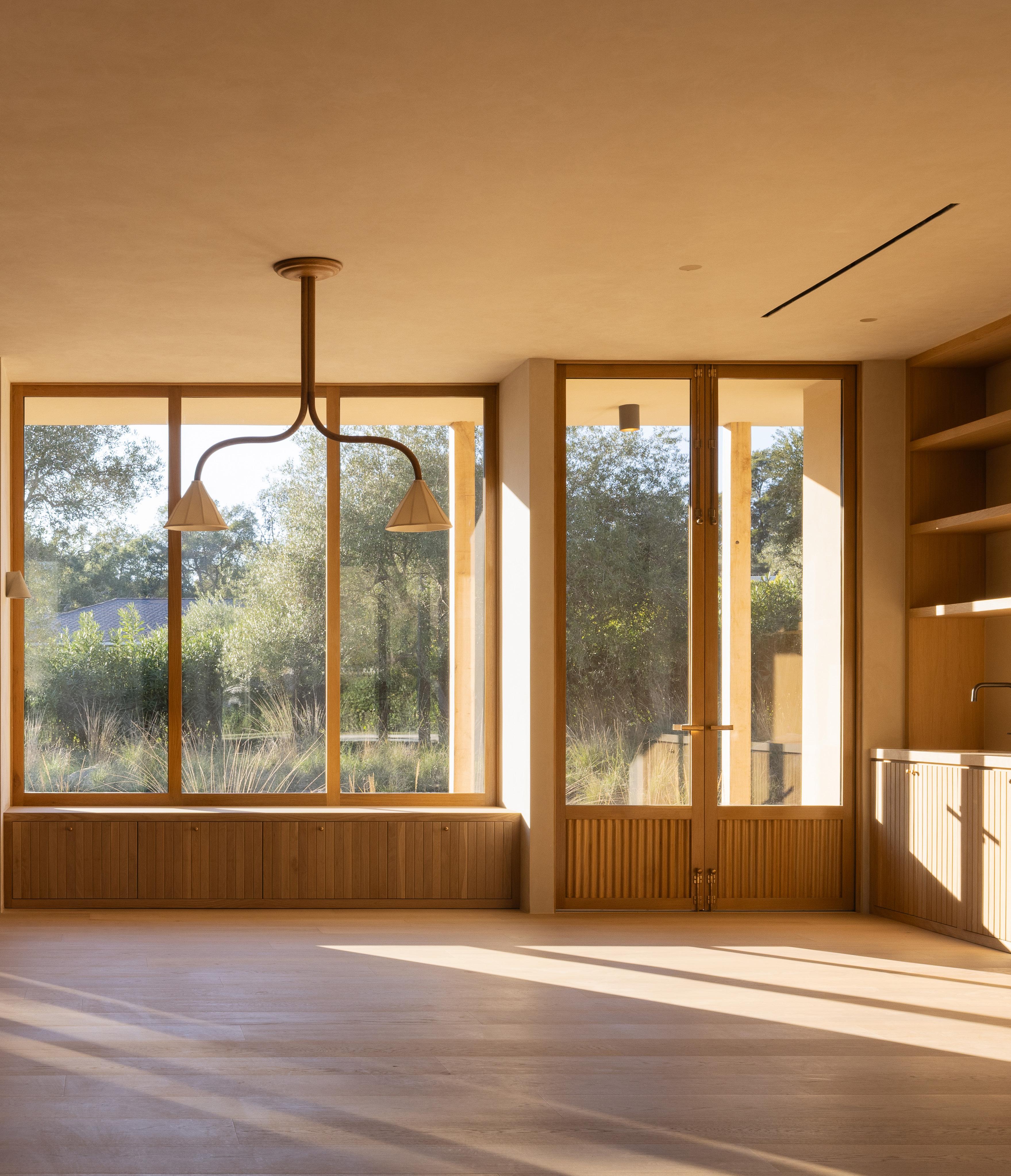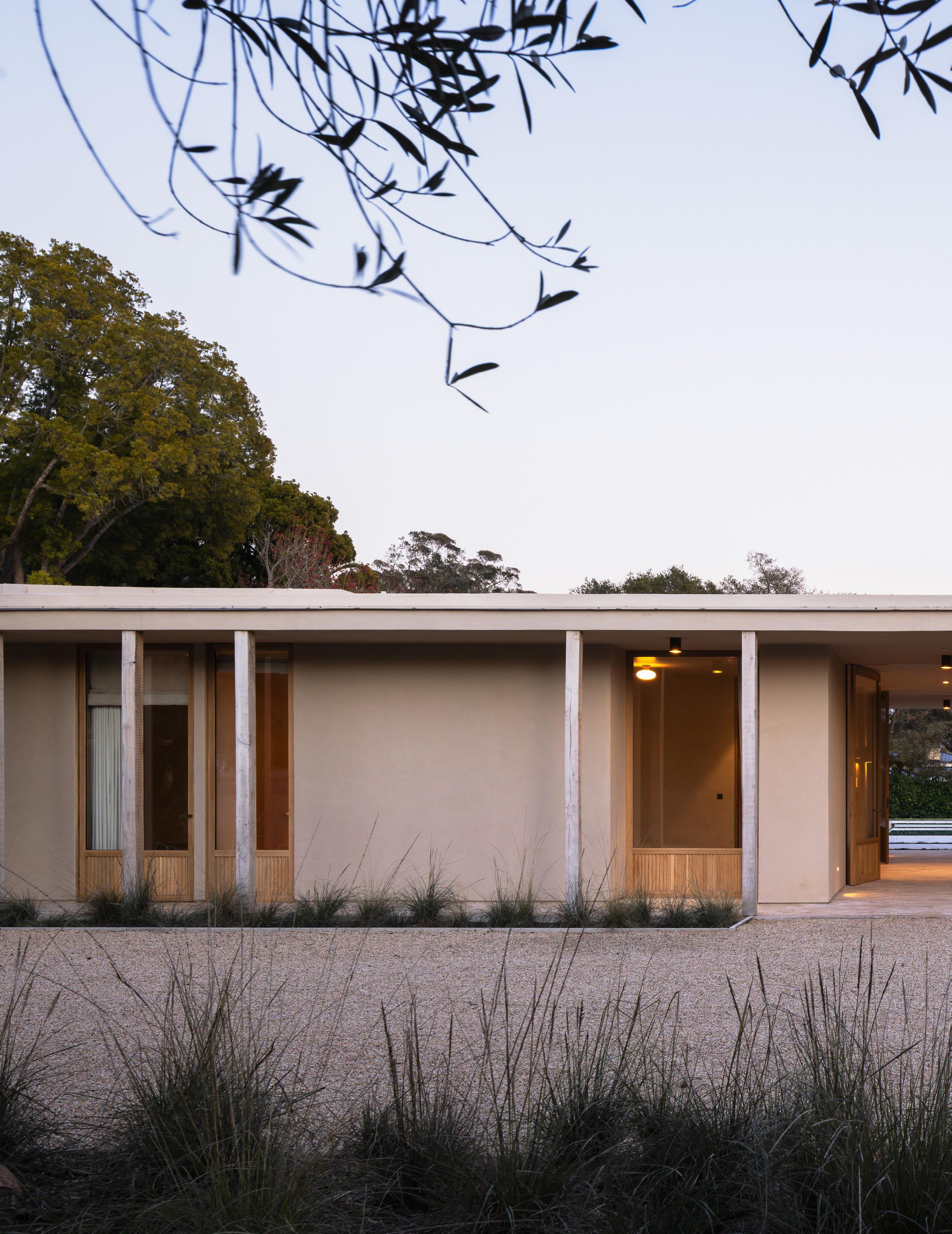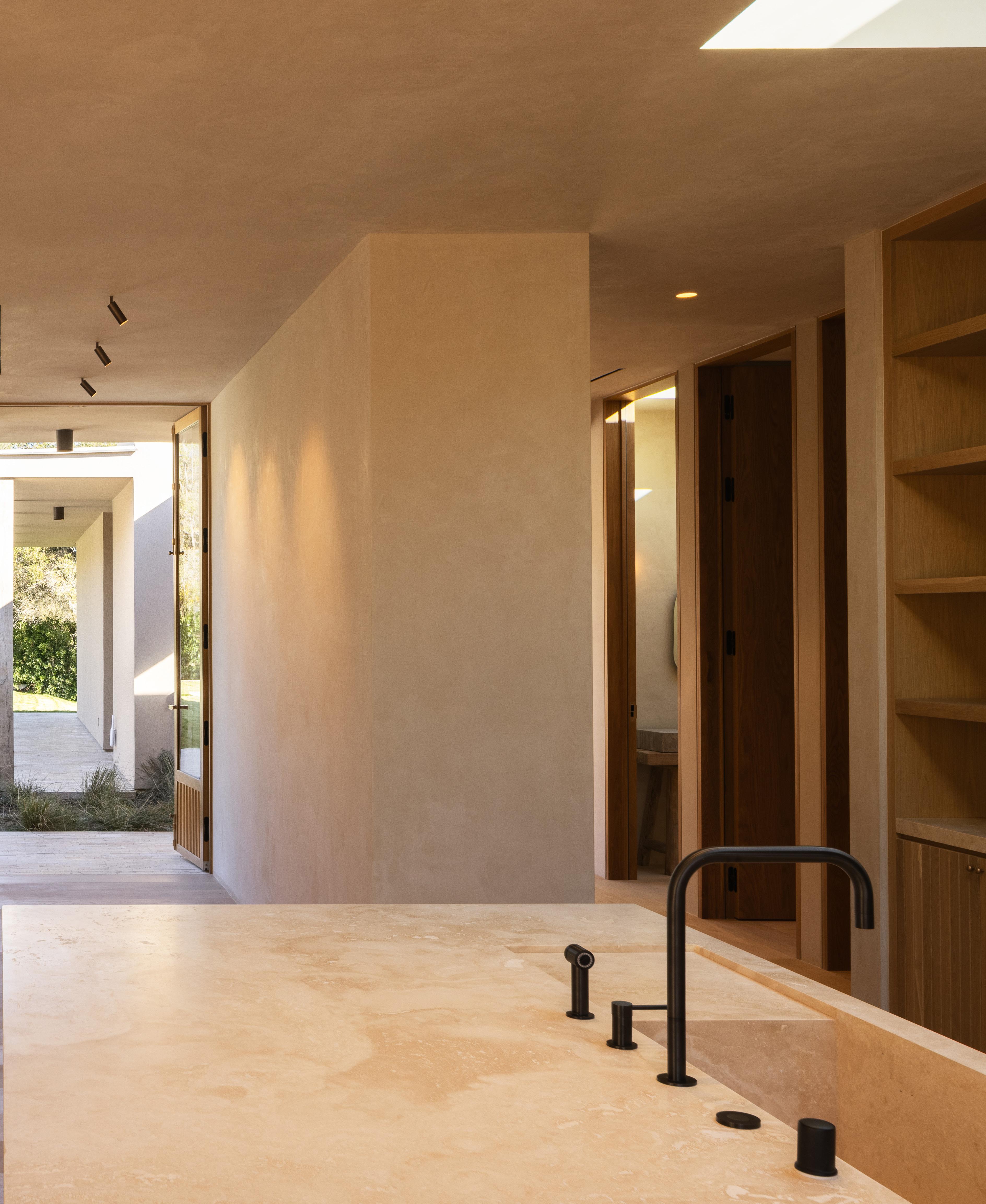 The home unfolds across a seamless single-story floor plan that prioritizes ease, flow, and livability. Natural materials anchor the interiors, creating a calm and grounded atmosphere throughout the living spaces.