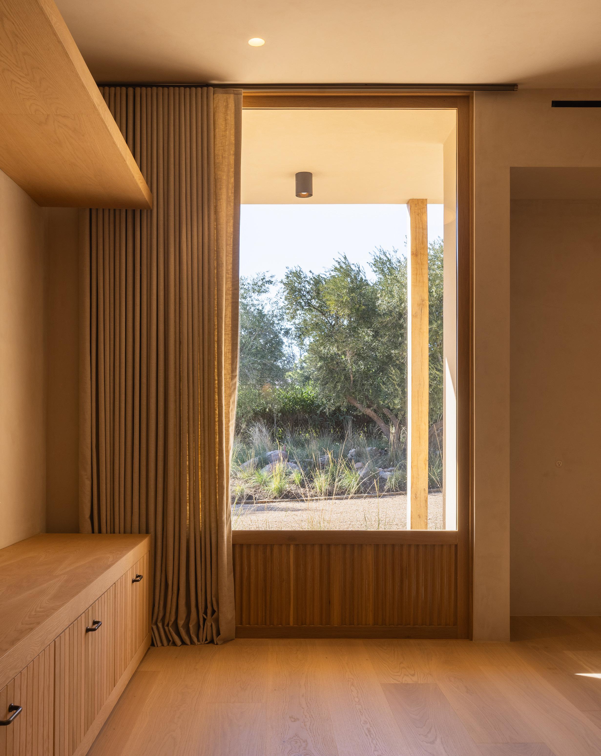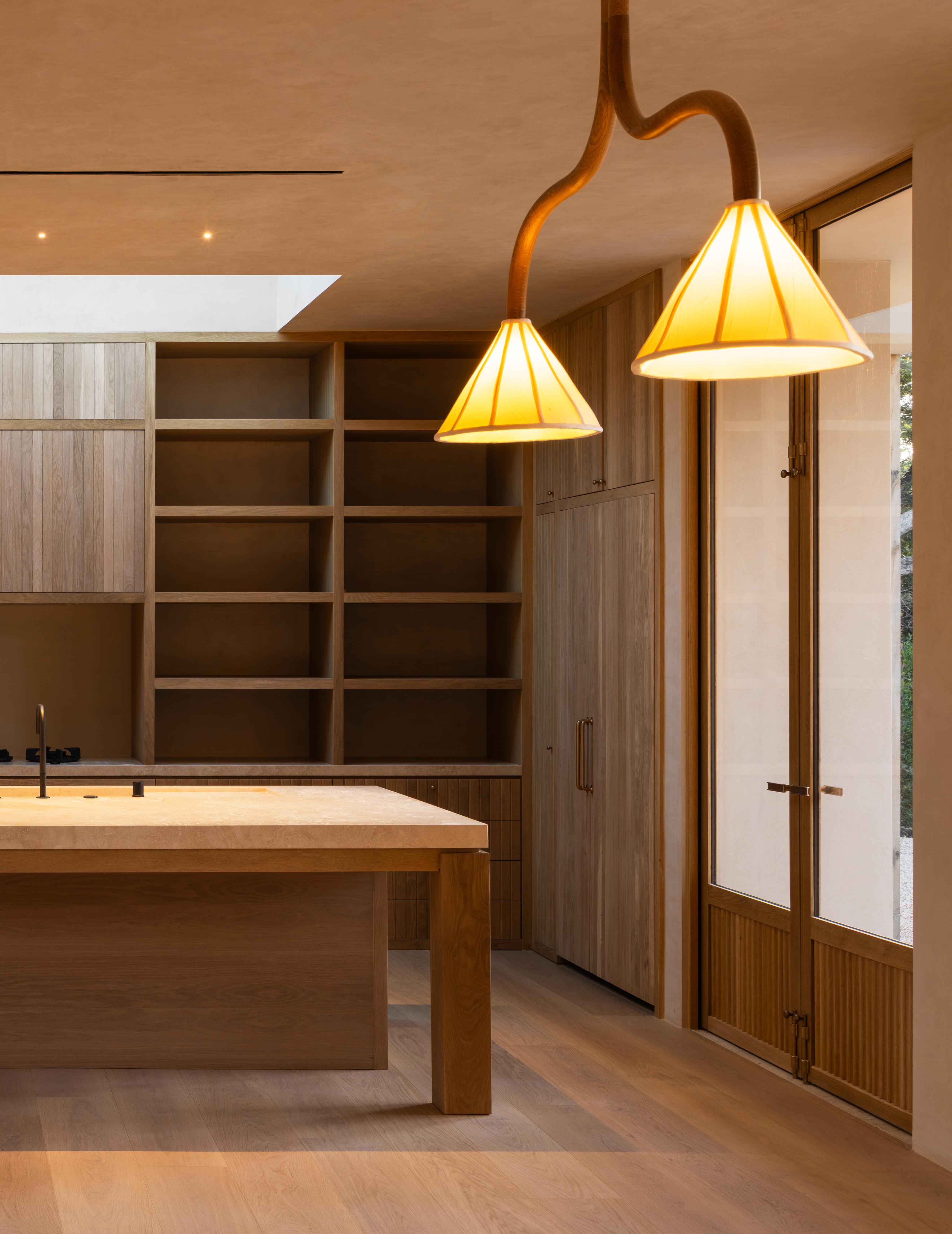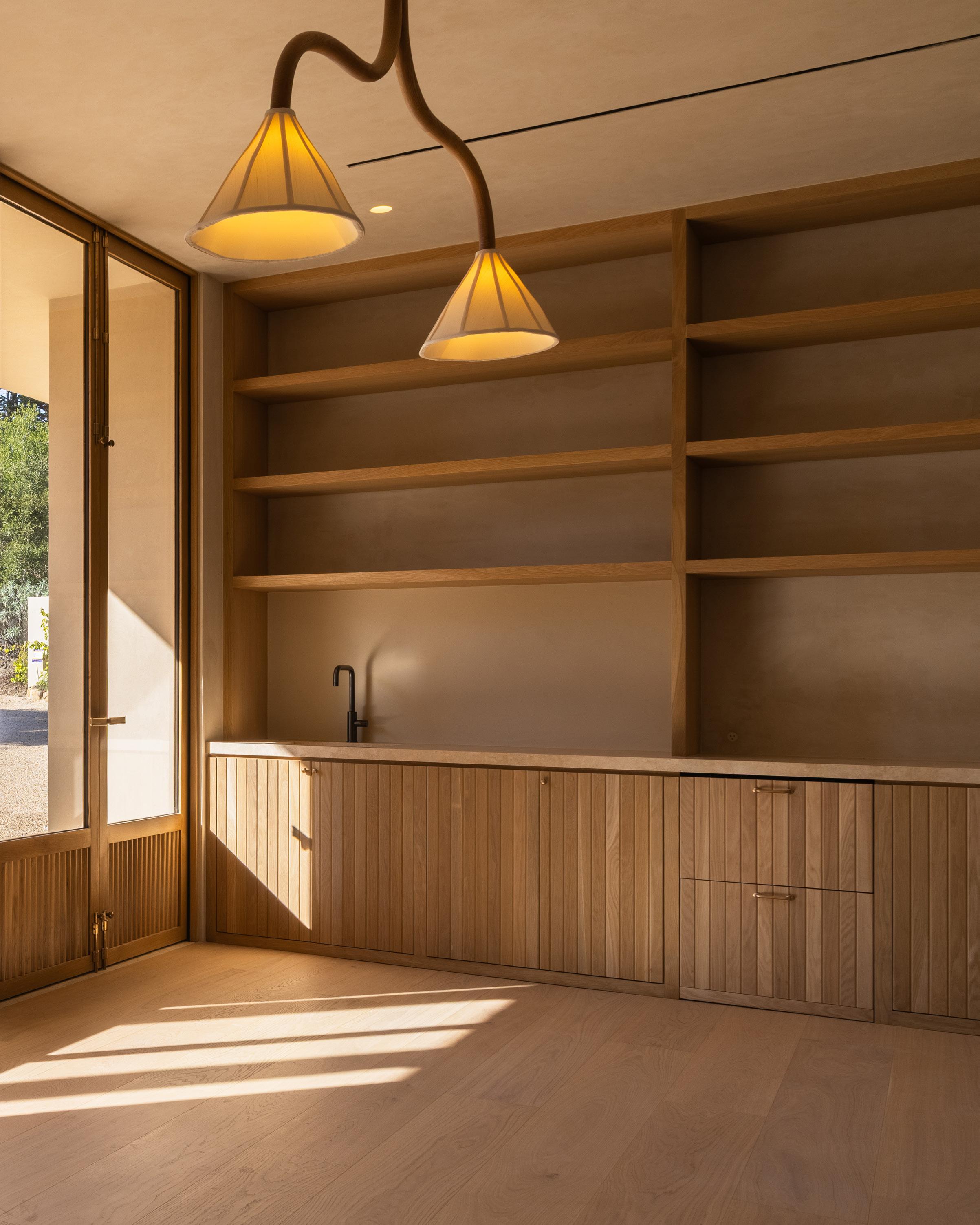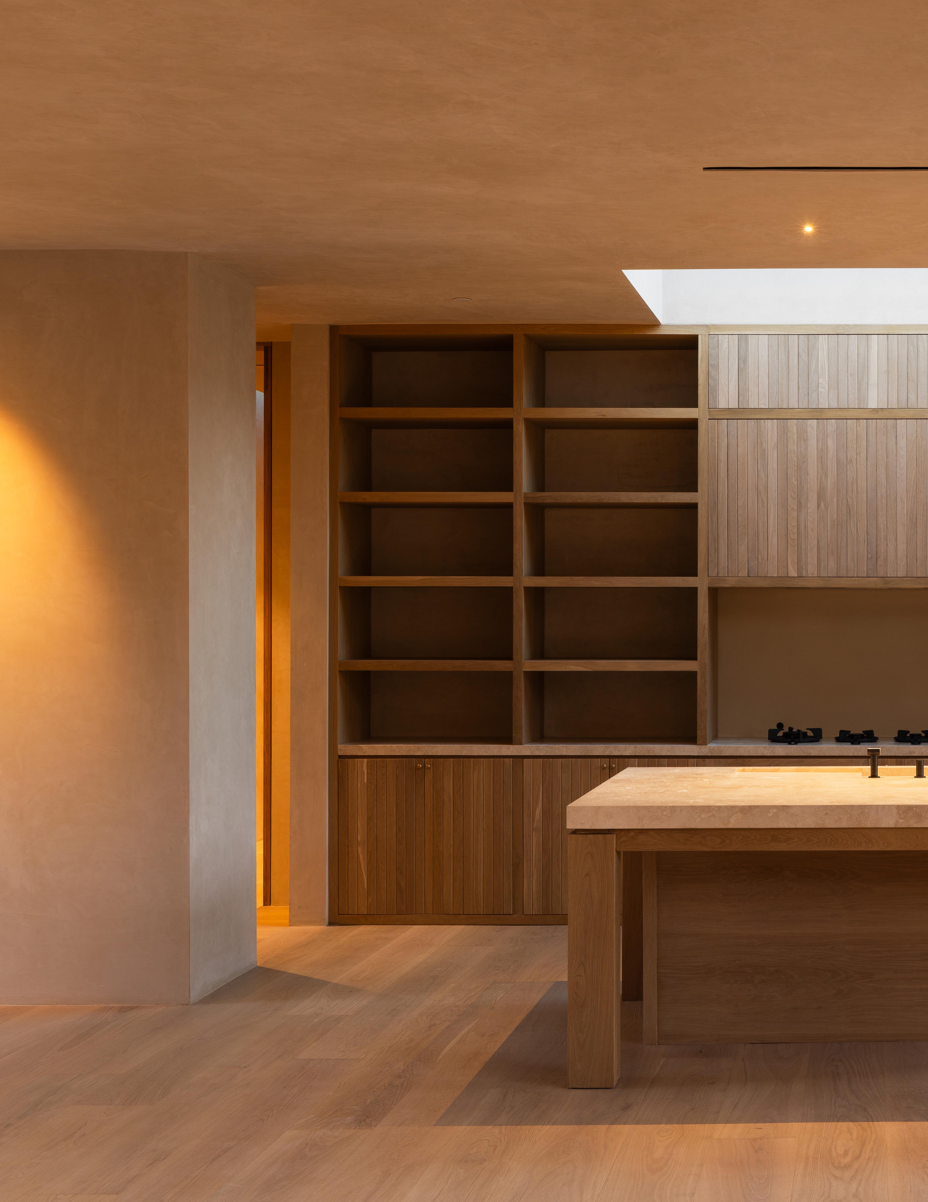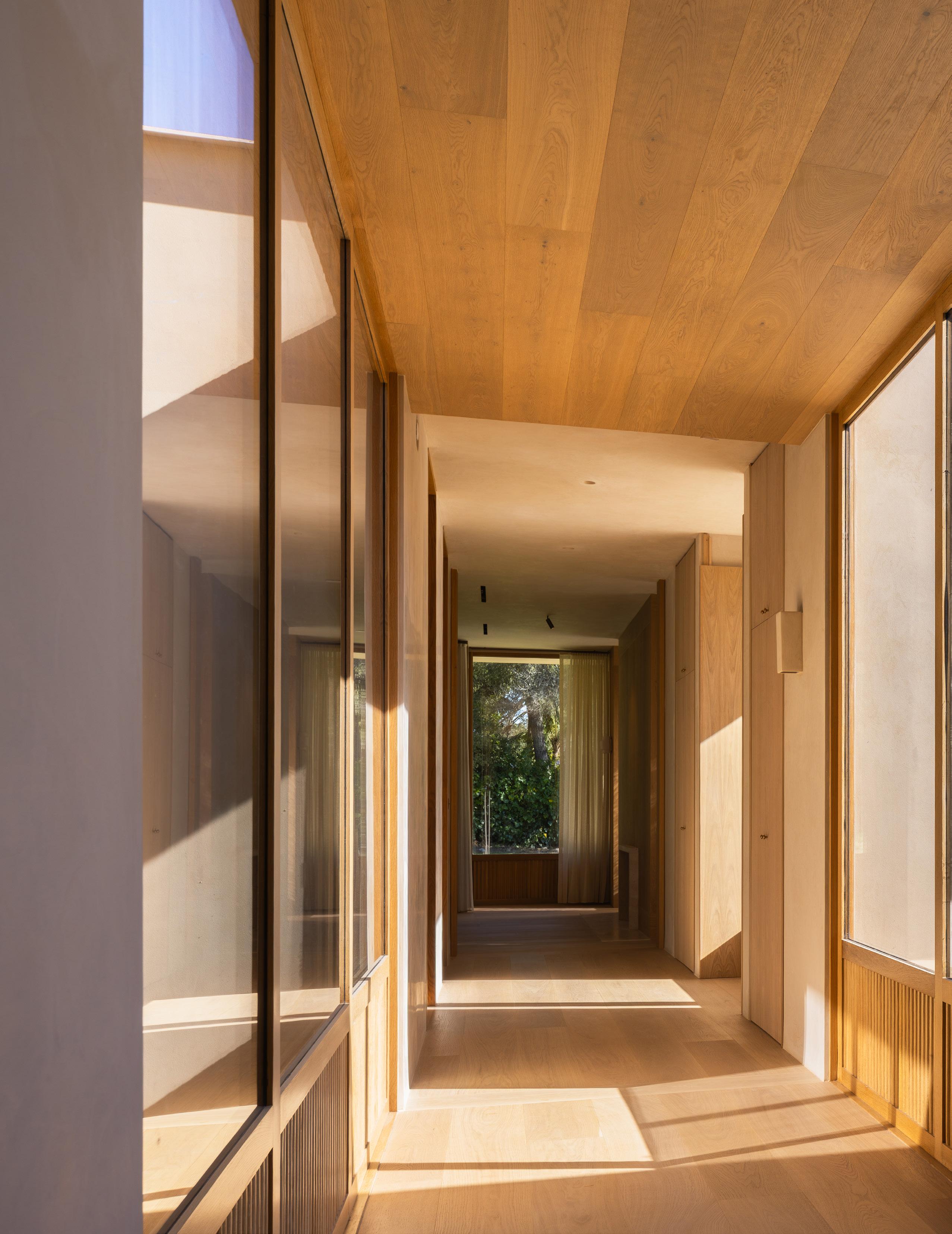 The home unfolds across a seamless single-story floor plan that prioritizes ease, flow, and livability. Natural materials anchor the interiors, creating a calm and grounded atmosphere throughout the living spaces.