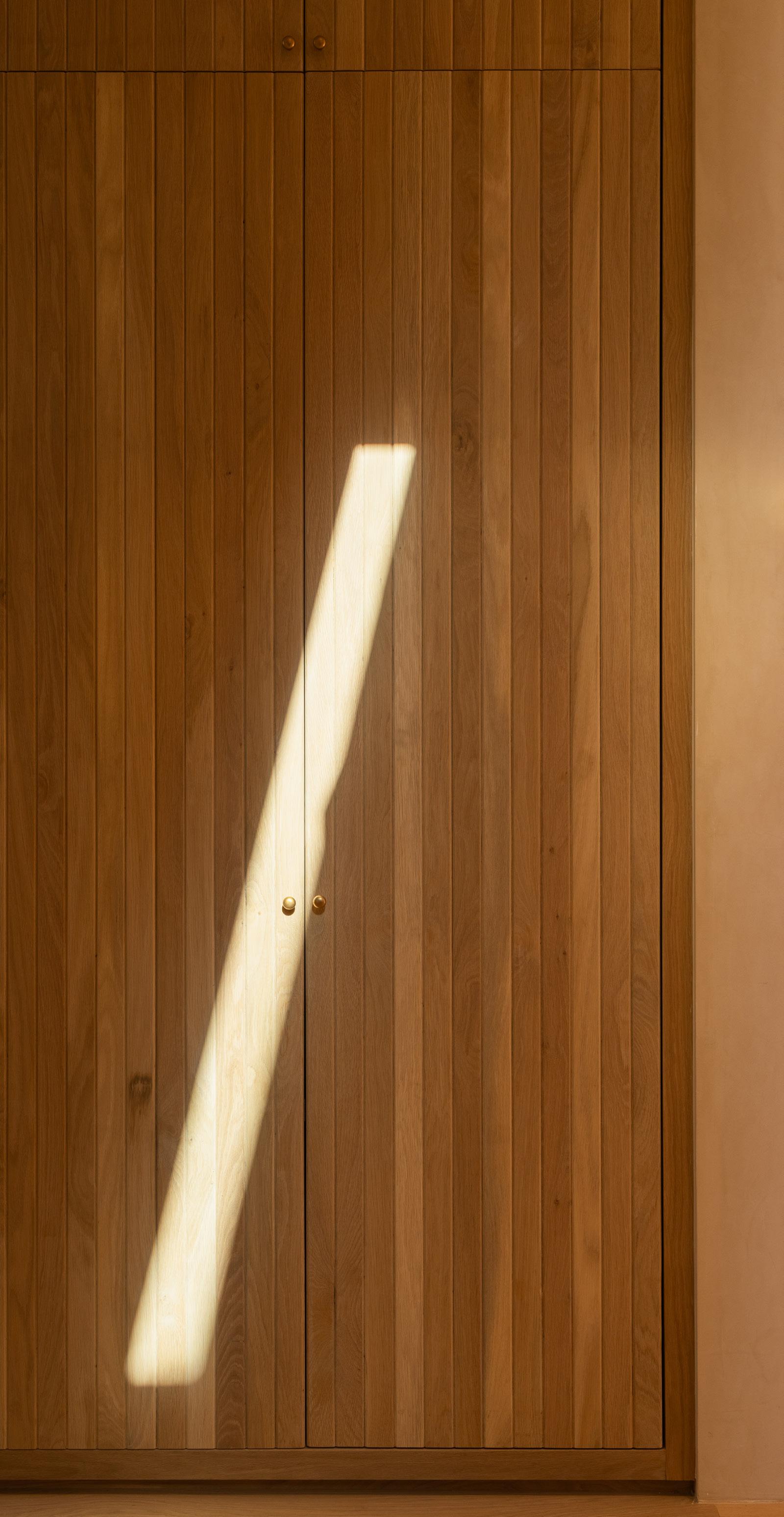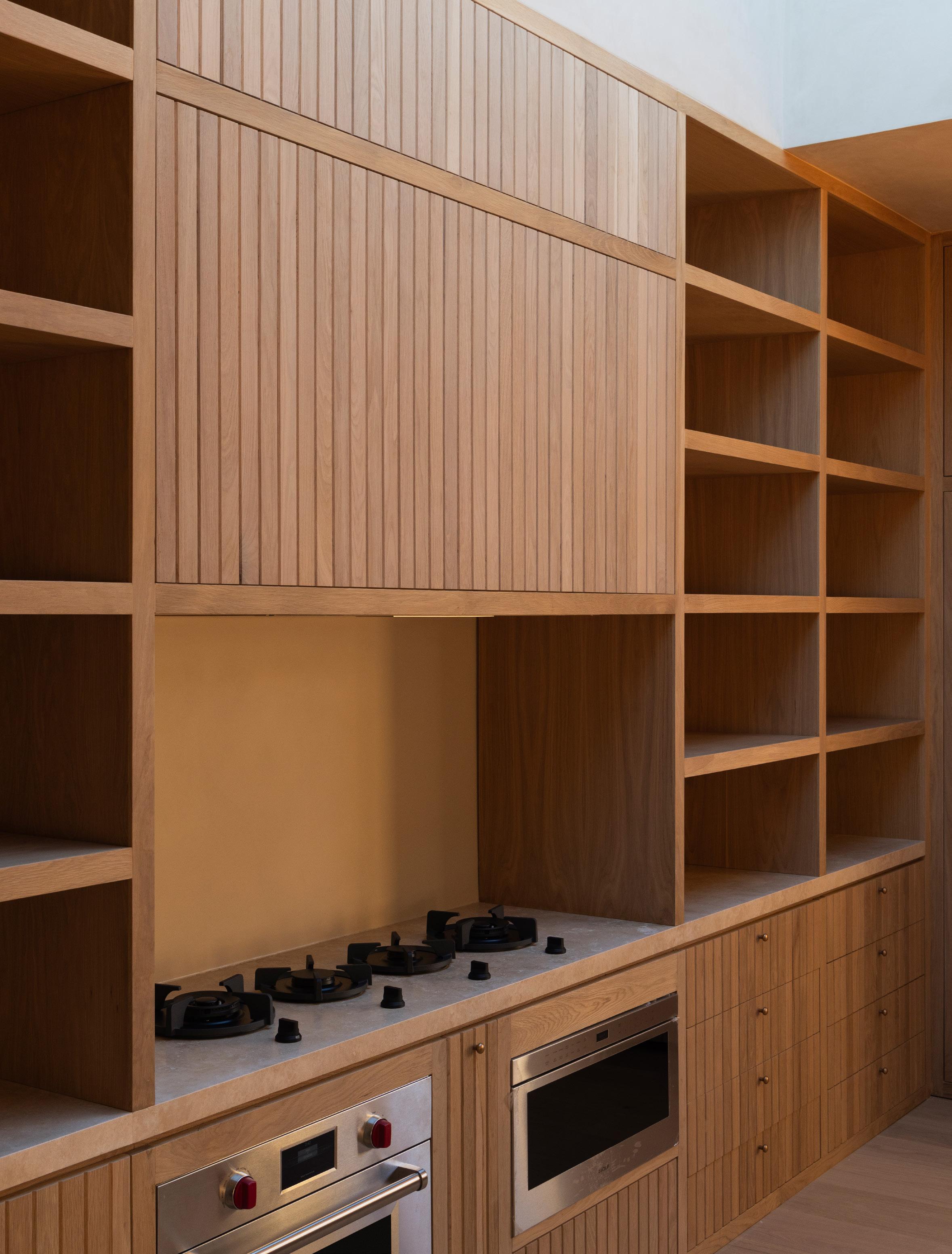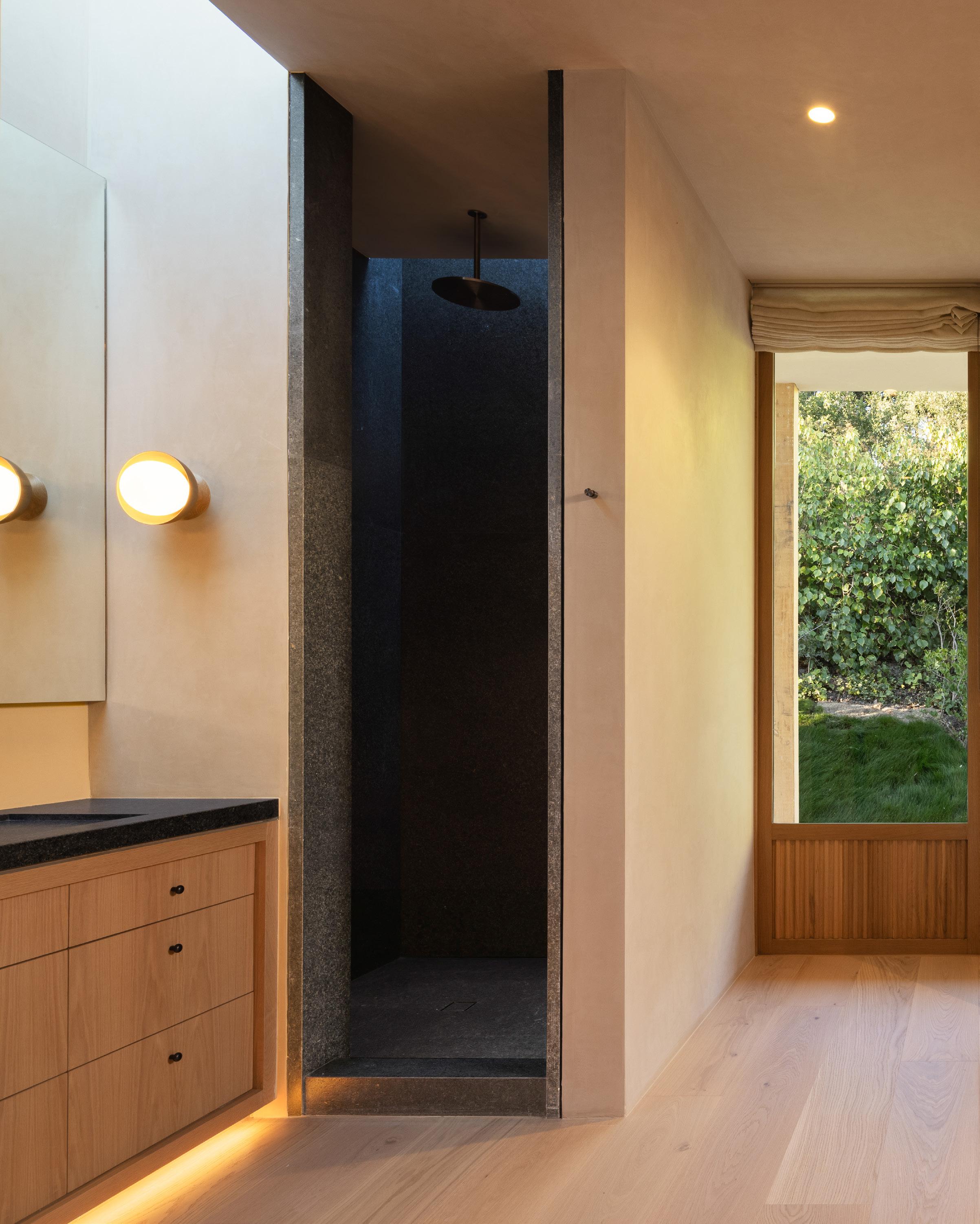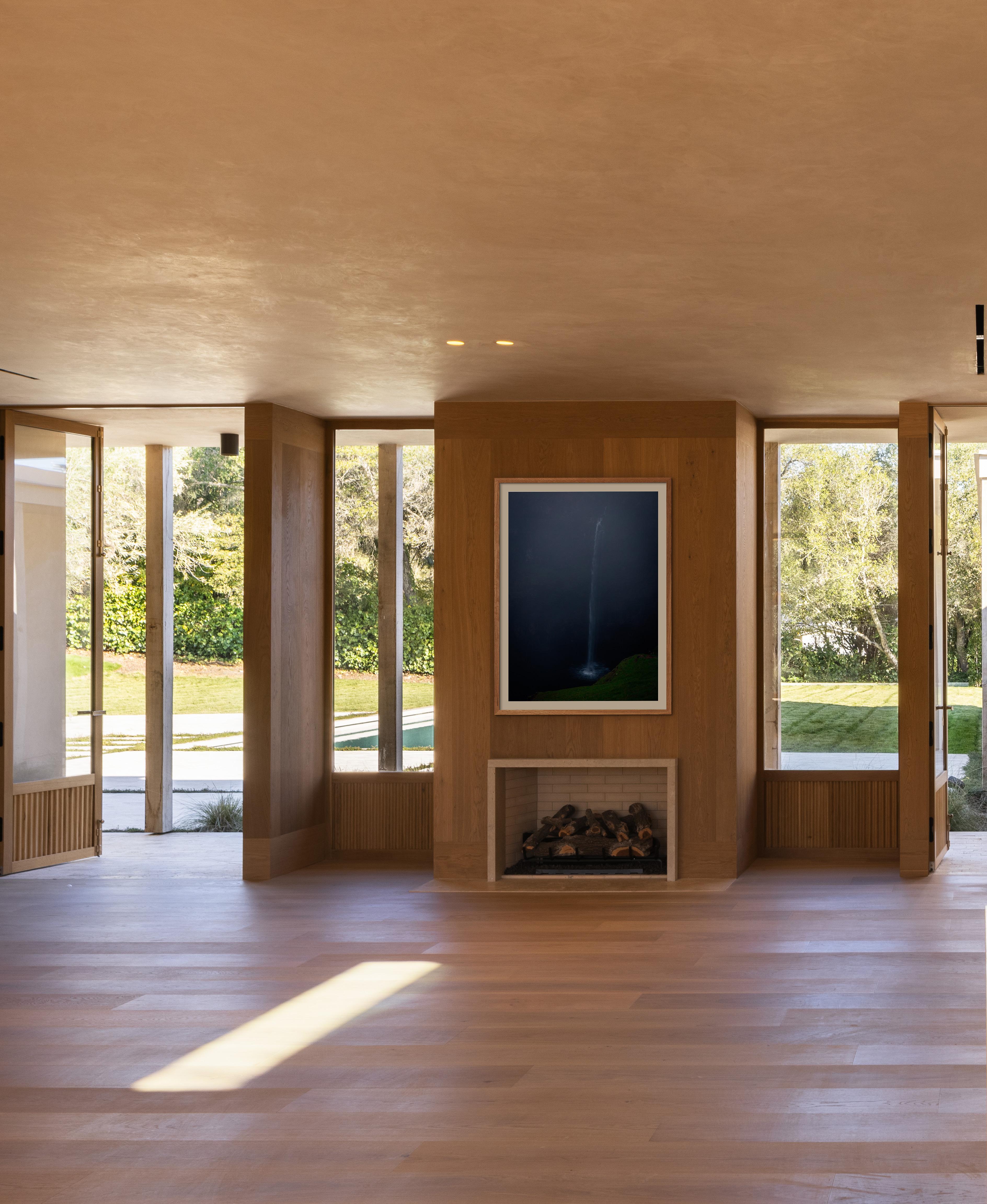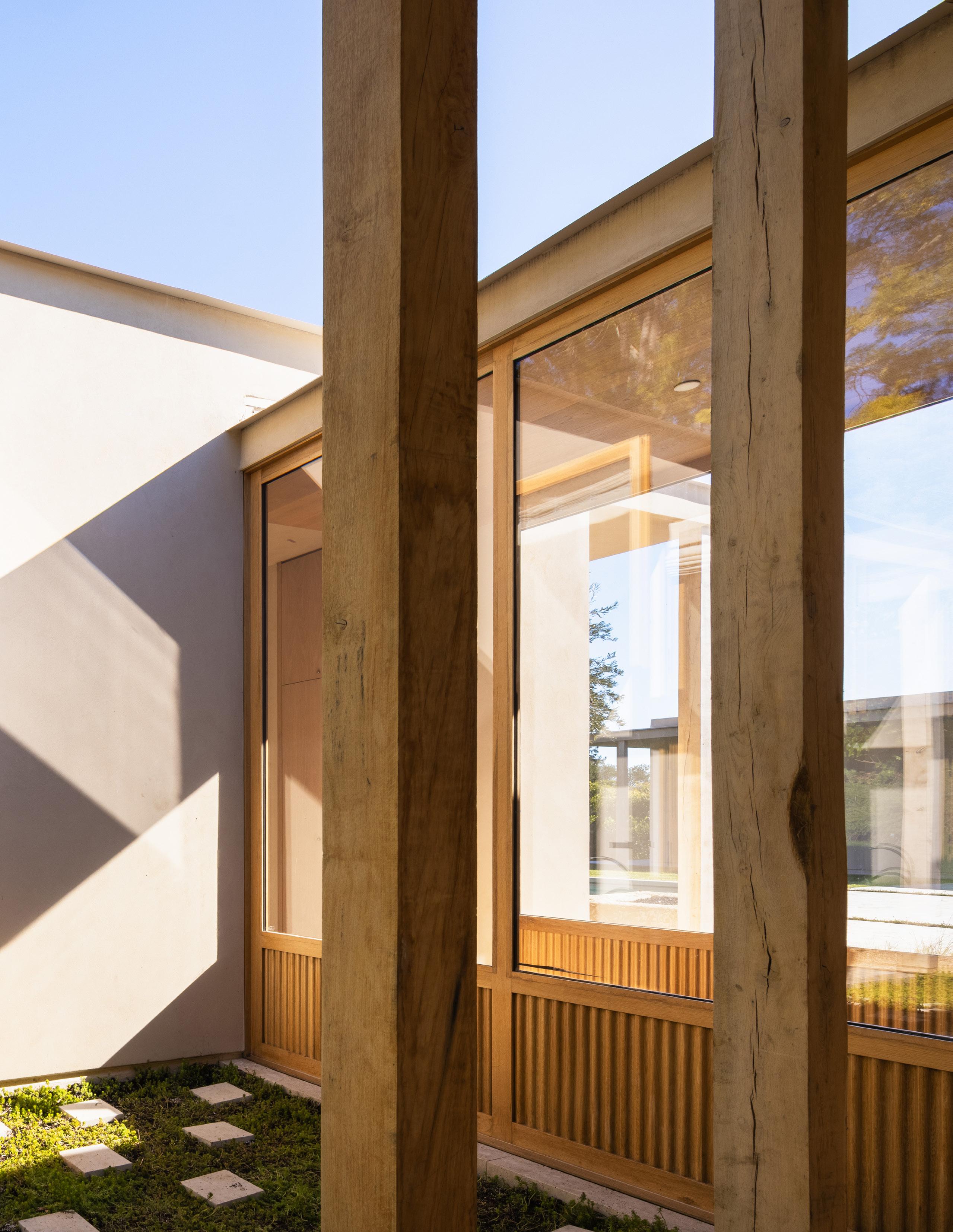 The home unfolds across a seamless single-story floor plan that prioritizes ease, flow, and livability. Natural materials anchor the interiors, creating a calm and grounded atmosphere throughout the living spaces.