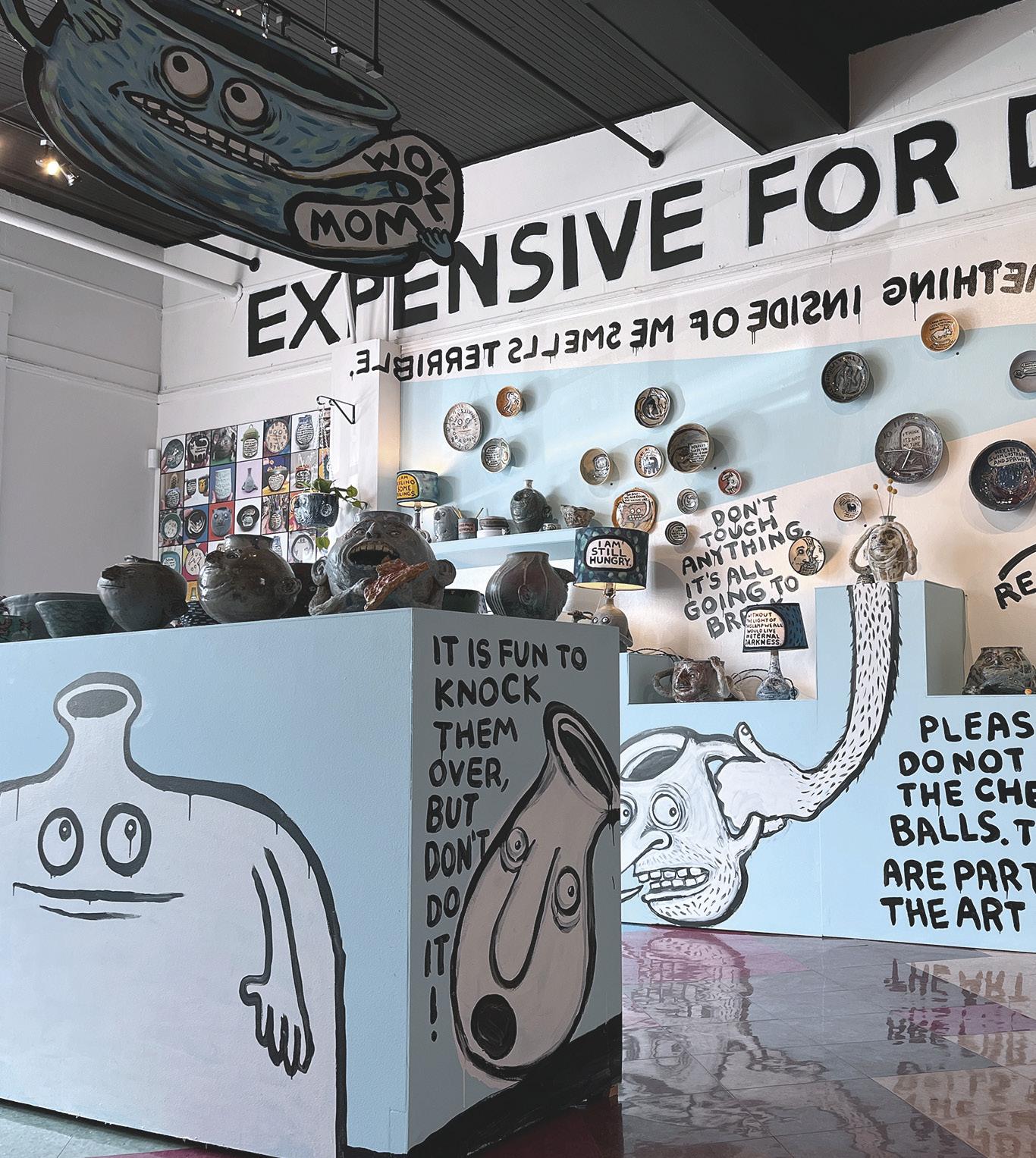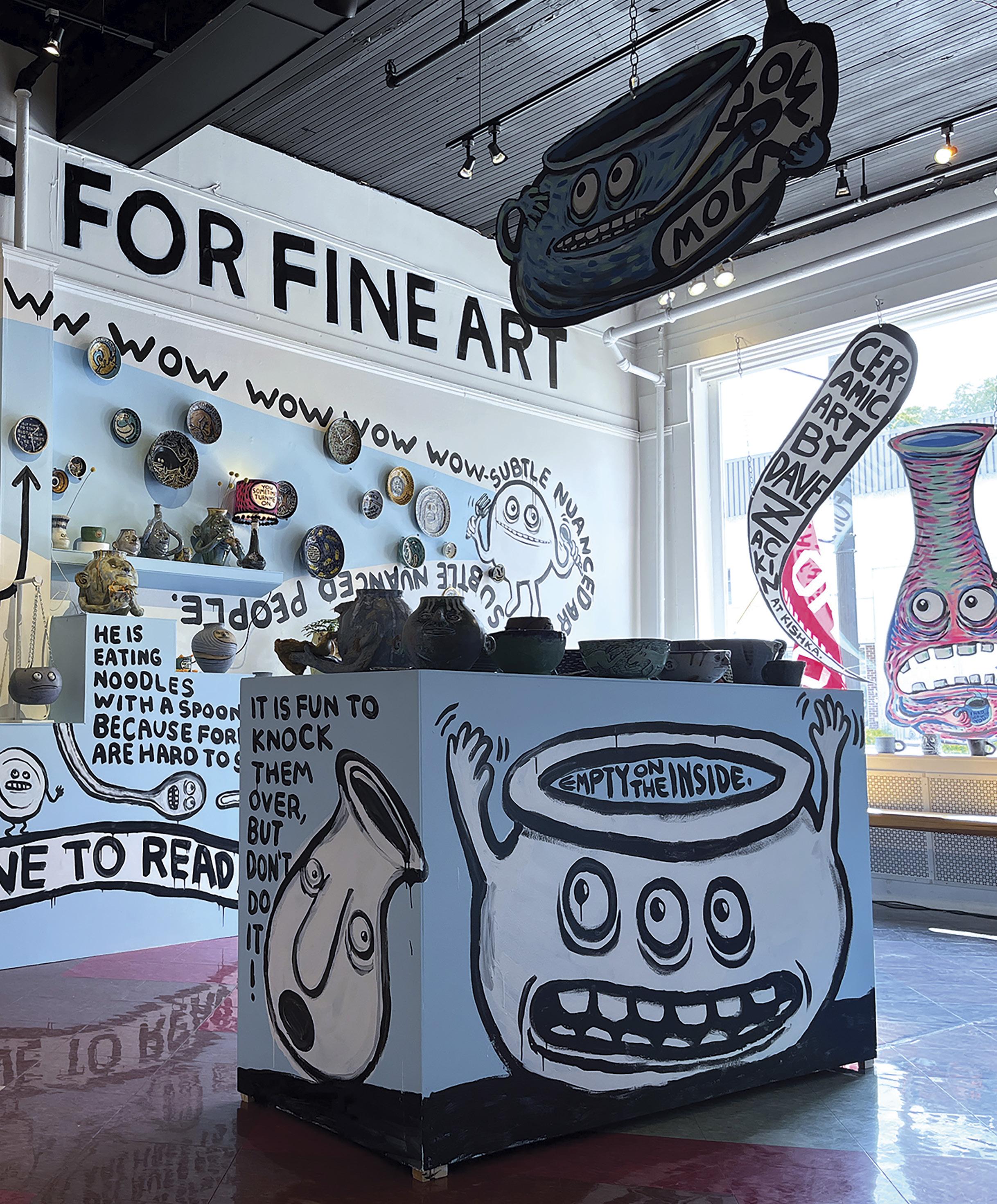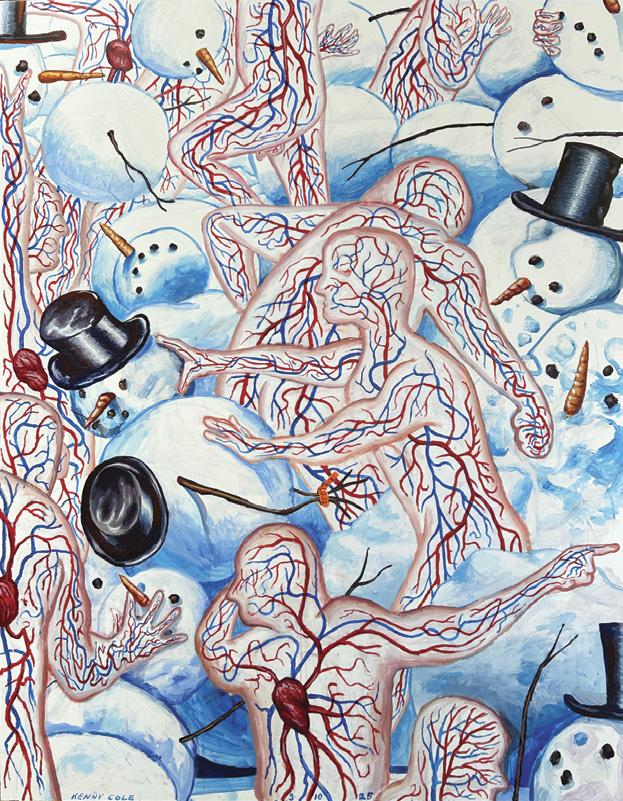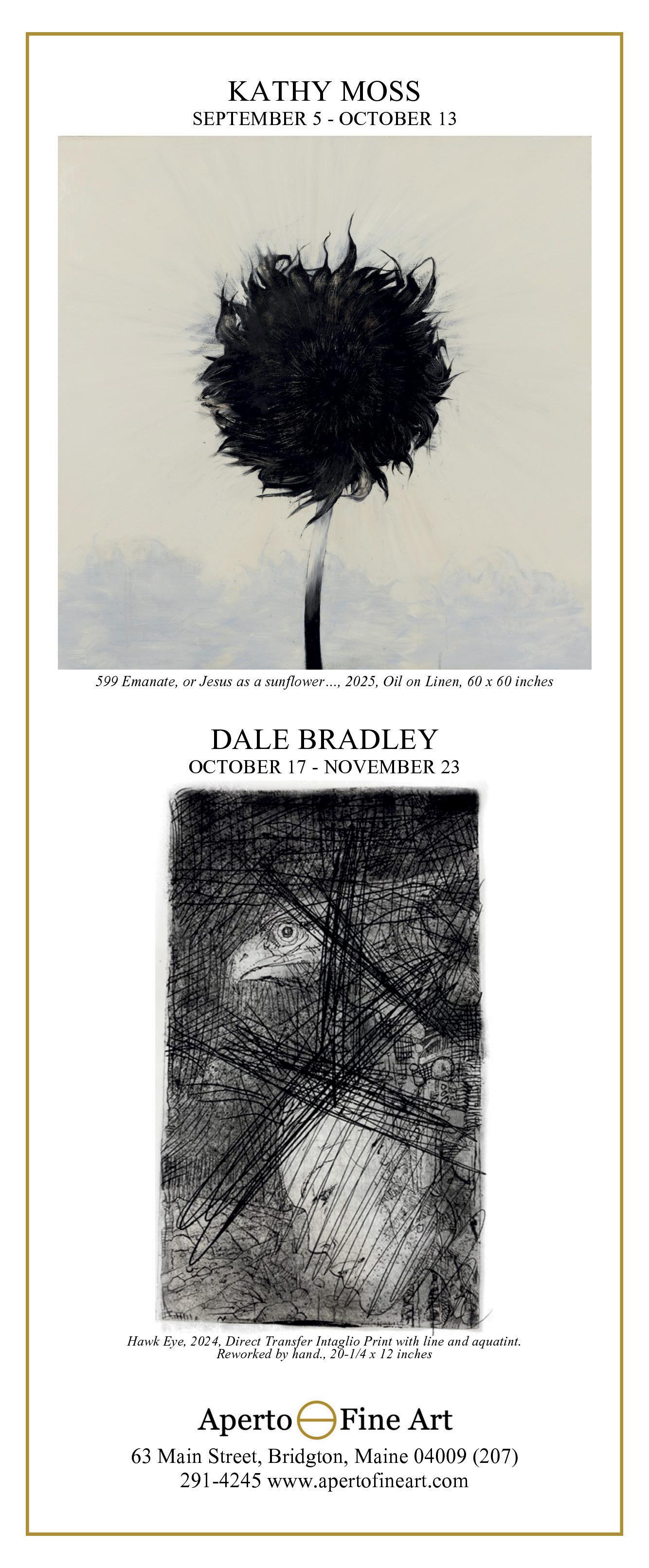 (14) Kathleen George, Meeting Of The Minds, 2023, acrylic paint and copper leaf on wood panel, 14 x 13". Courtesy of the artist. (28) Don Ed Hardy, Pluto, 2002, acrylic on archival synthetic paper, 34 x 38". Courtesy of the artist and Track 16 Gallery, Los Angeles. (34) Installation view of Cheap for fine art, expensive for dishes by Dave Zackin at Kishka Gallery. Courtesy of the gallery. (46) Will Kasso Condry of Juniper Creative, recipient of the 2025 Herb Lockwood Prize. Photo: Isora Lithgow Creations. (60) Barbara Kasten: Structure, Light, Land at The Glass House in New Canaan, CT. (61) O’Neil Scott, Fading Promises, 2025, oil on canvas, 72 x 60". Courtesy the artist and the Zillman Art Museum.