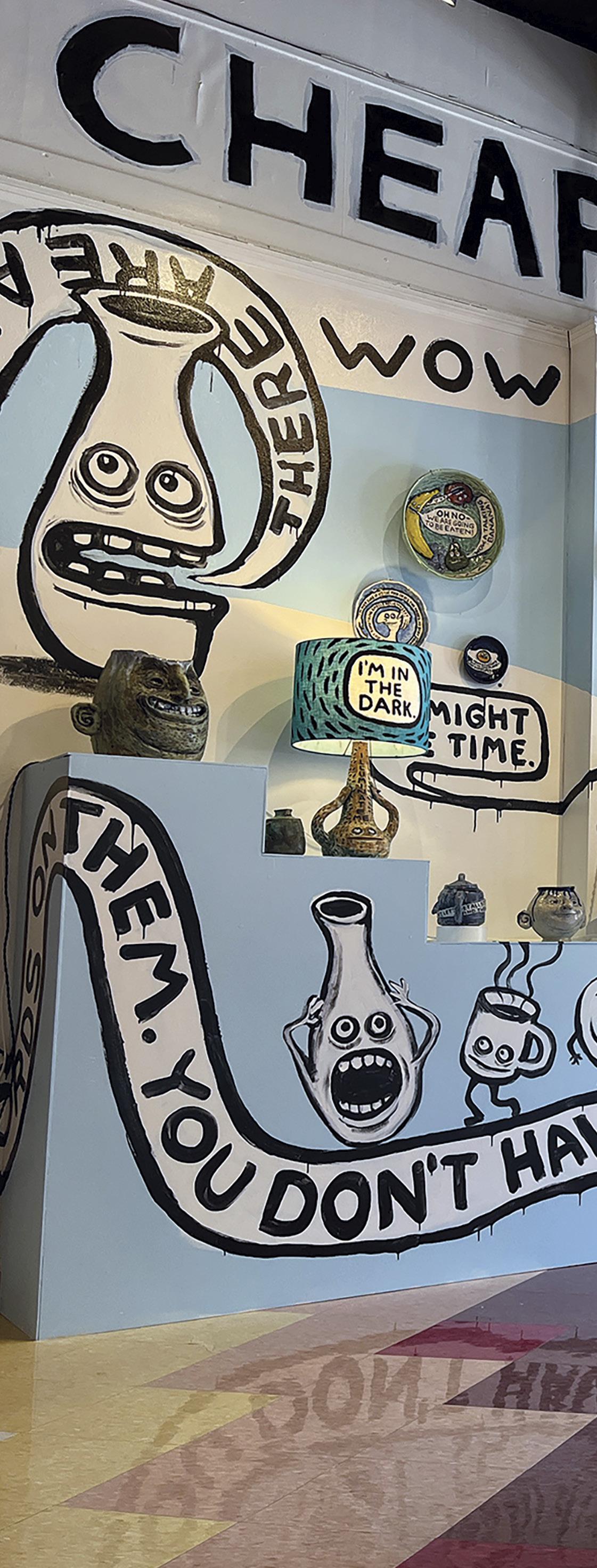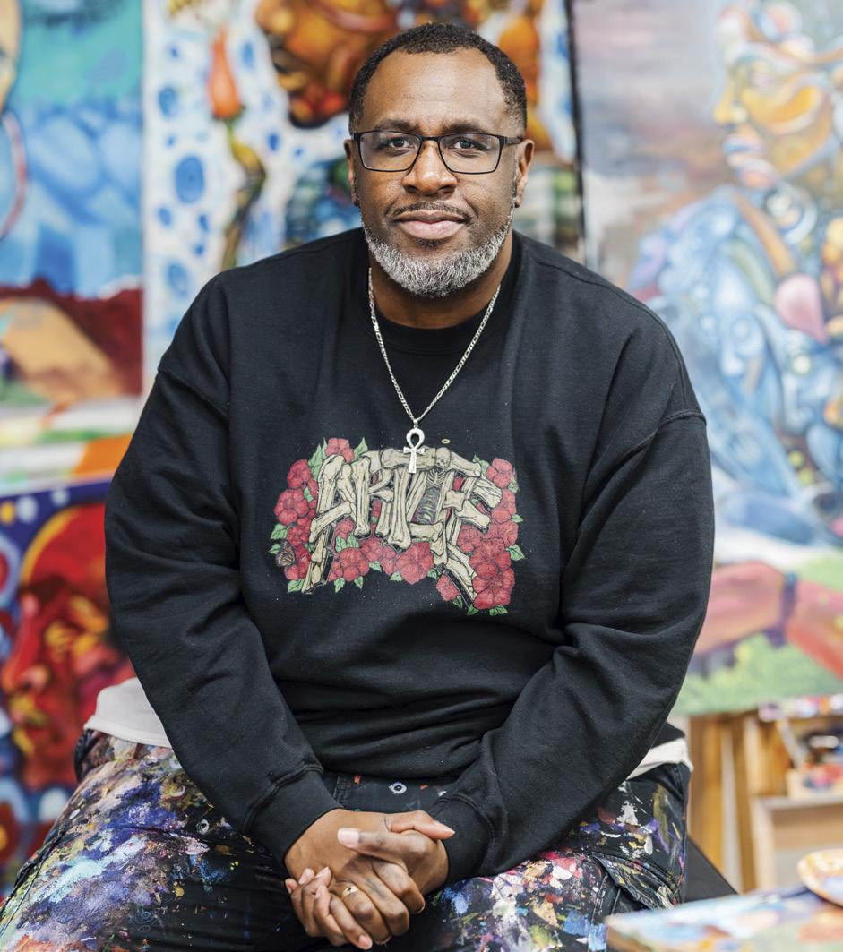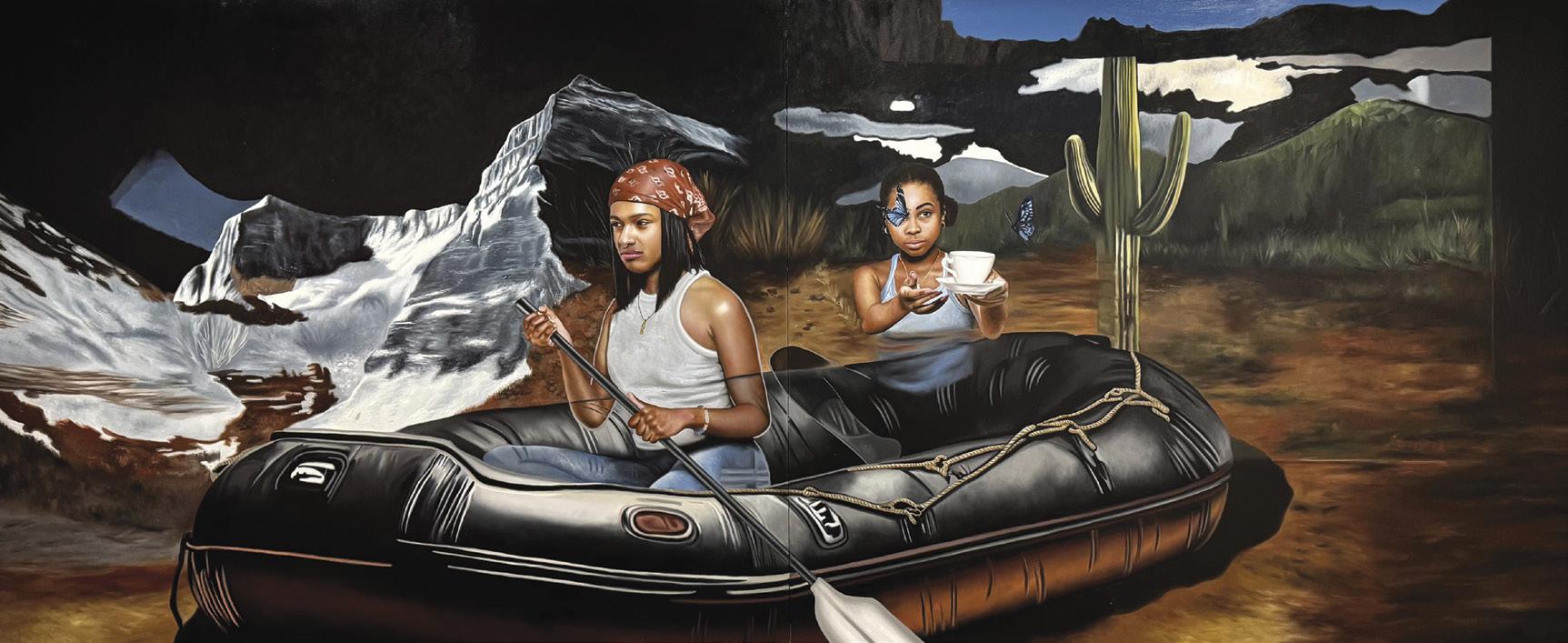 (14) Kathleen George, Meeting Of The Minds, 2023, acrylic paint and copper leaf on wood panel, 14 x 13". Courtesy of the artist. (28) Don Ed Hardy, Pluto, 2002, acrylic on archival synthetic paper, 34 x 38". Courtesy of the artist and Track 16 Gallery, Los Angeles. (34) Installation view of Cheap for fine art, expensive for dishes by Dave Zackin at Kishka Gallery. Courtesy of the gallery. (46) Will Kasso Condry of Juniper Creative, recipient of the 2025 Herb Lockwood Prize. Photo: Isora Lithgow Creations. (60) Barbara Kasten: Structure, Light, Land at The Glass House in New Canaan, CT. (61) O’Neil Scott, Fading Promises, 2025, oil on canvas, 72 x 60". Courtesy the artist and the Zillman Art Museum.