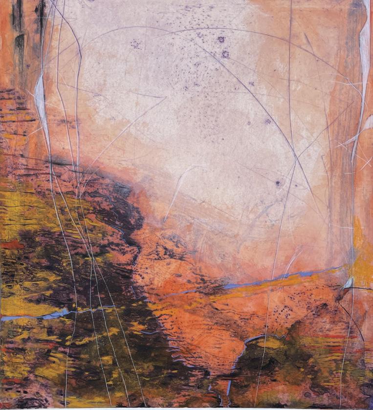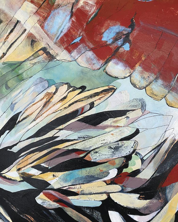 the brilliant oranges and golds of autumn foliage pop against the deep blue sky, or watching a kaleidoscope of monarch butterflies as they pass through on their annual migration. My painting process is defined by layering. Each piece contains up to 15-20 strata of pigmented wax…The highly textured surfaces of these encaustic paintings invite viewers to spend more time with them. I like the artist’s hand to be visible in my work, and the longer you spend looking at these paintings, the more you see–subtle gestures, hidden textures, and even ‘mistakes’ that I’ve decided to leave in...”
