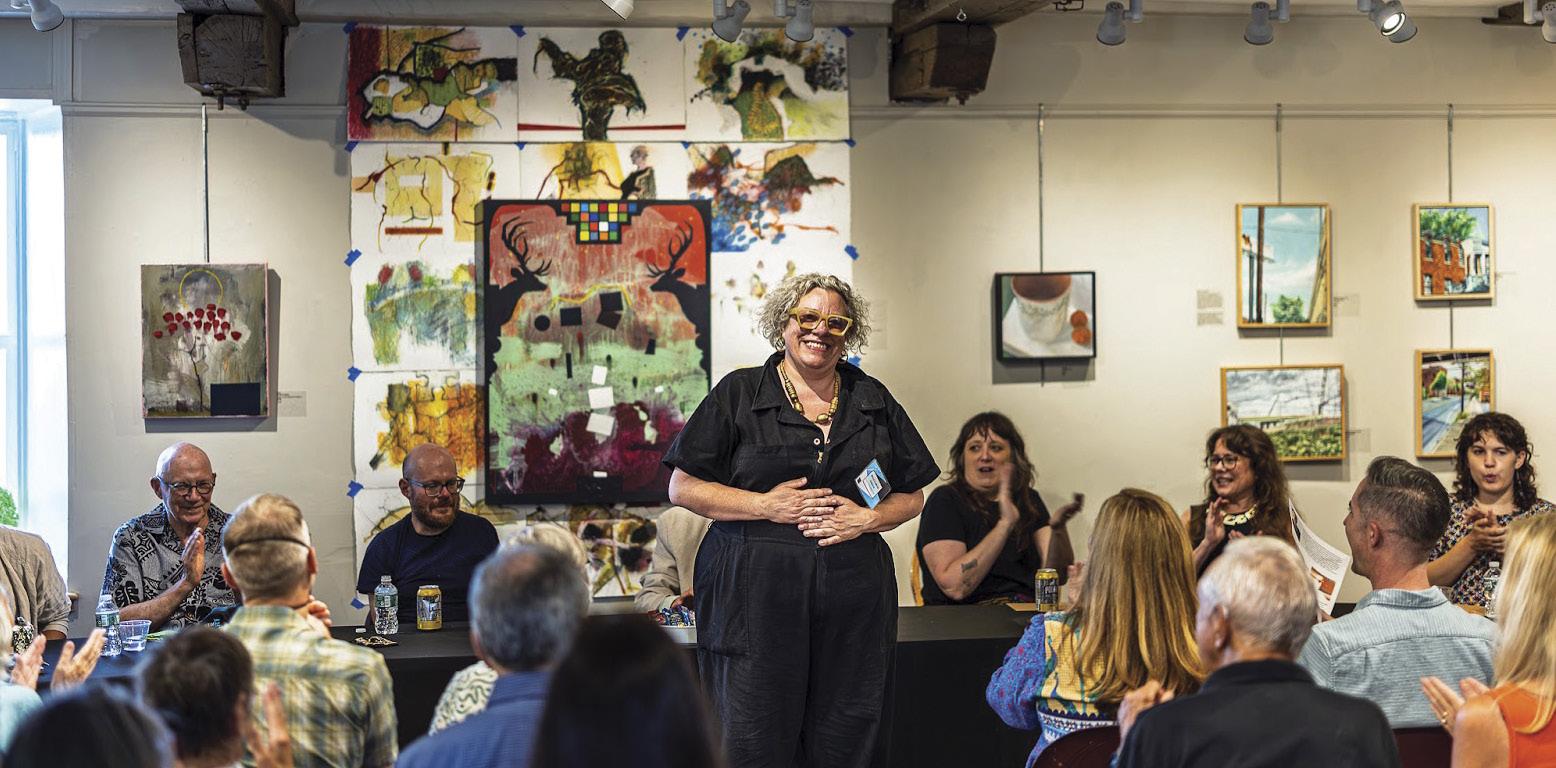 1. On July 28, 2025, at Newburyport Art in Newburyport, MA, in celebration of the exhibition Coming Home, artists discussed how Newburyport has influenced their creative passions in visual art, film, music and writing. Pictured: Belle Carver Struck with panelists Paul Wann, Michael Angelis, Kate Bolick, Nickole Beckwith, Paul-Emile Cendron, Camela Murphy, Sam Szabo, Gordon Przybyla and Edward “Teddy” Speck. Photo: Eric Wojnarowski.