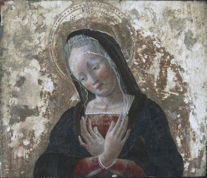 Antonio Cicognara, Fragment of the Virgin Mary from an Adoration or Annunciation (detail), about 1480, tempera and gold leaf on a gesso ground on a wood panel. Bequest of the John T. Dallas Estate; P.962.30. At Hood Museum of Art, Dartmouth.